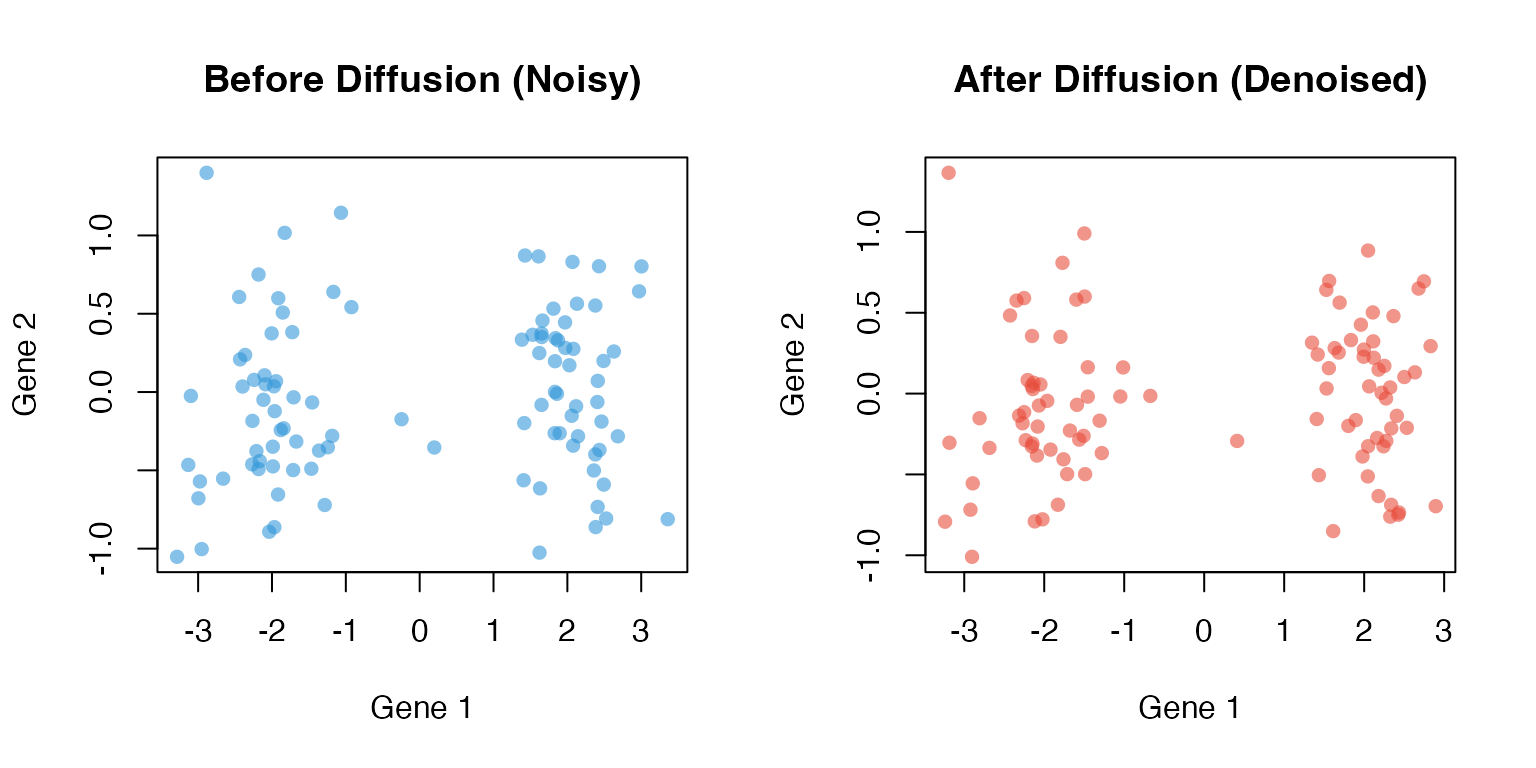 main = "Before Diffusion (Noisy)", xlab = "Gene 1", ylab = "Gene 2")