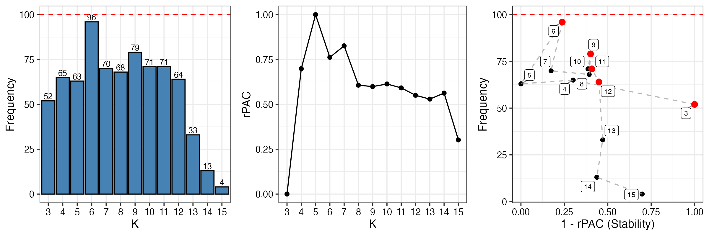- Right panel (Trade-off): Combines frequency and stability. Points in the upper-right corner (high frequency, high stability) are optimal. The red point indicates the recommended K.