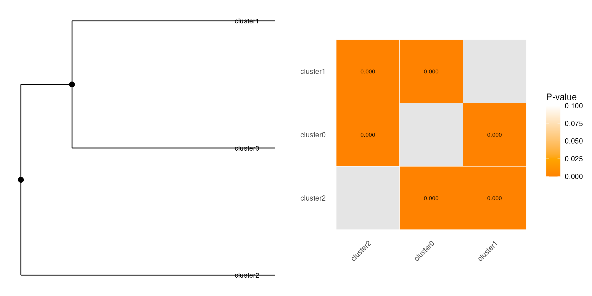 - Heatmap (right): Pairwise p-values. Red/orange = significant separation, white = similar