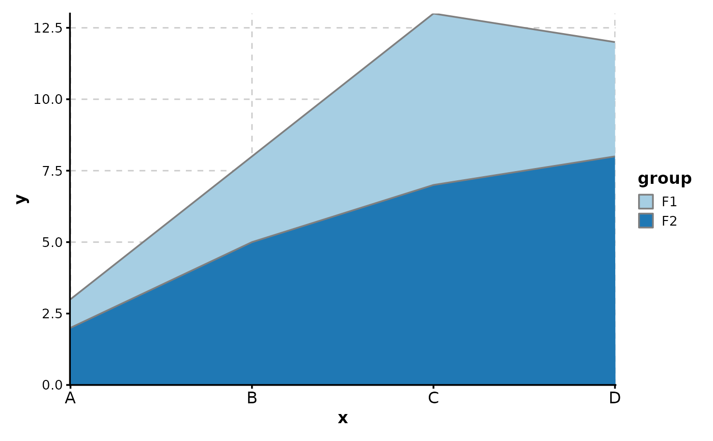 AreaPlot(data, x = "x", y = "y", split_by = "group", palette = c(F1 = "Blues", F2 = "Reds"))