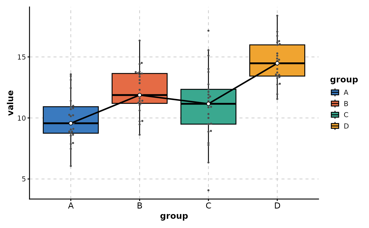 BeeswarmPlot(data, x = "group", y = "value", add_trend = TRUE)