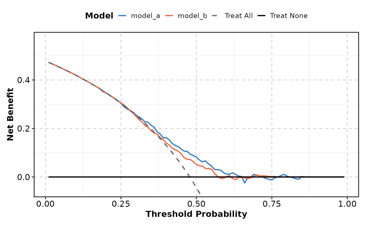 Creates decision curve analysis (DCA) plots for evaluating the clinical utility of prediction models. Shows net benefit across threshold probabilities, with reference strategies (treat-all, treat-none).