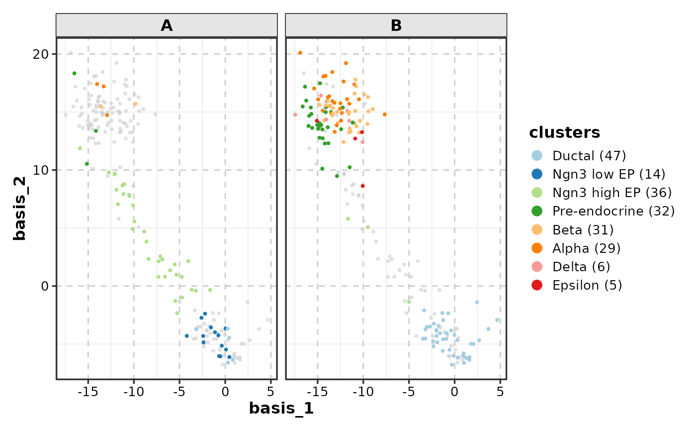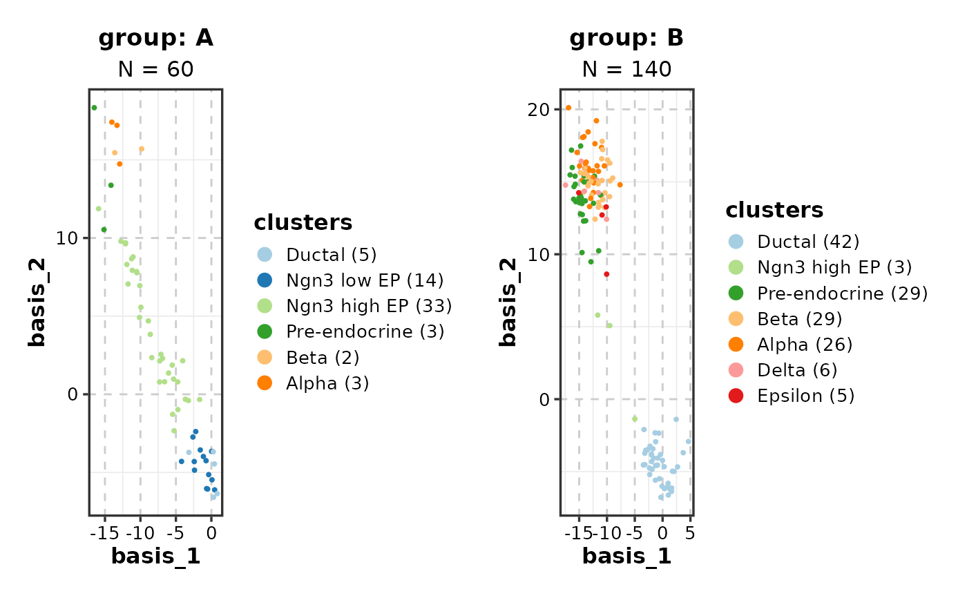 DimPlot(dim_example, dims = 1:2, group_by = "clusters", split_by = "group")