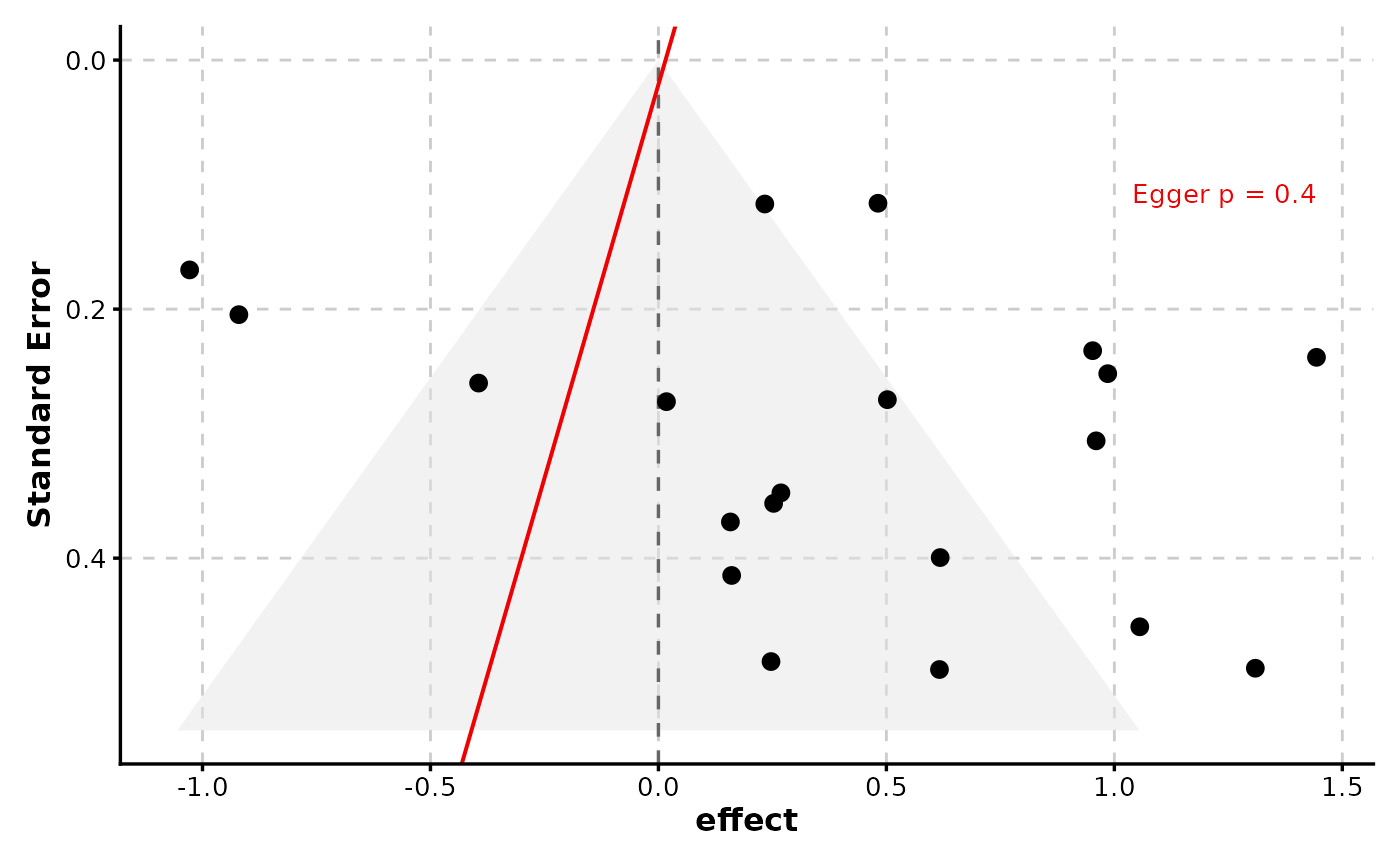 FunnelPlot(meta, estimate = "effect", se = "se", add_egger = TRUE)