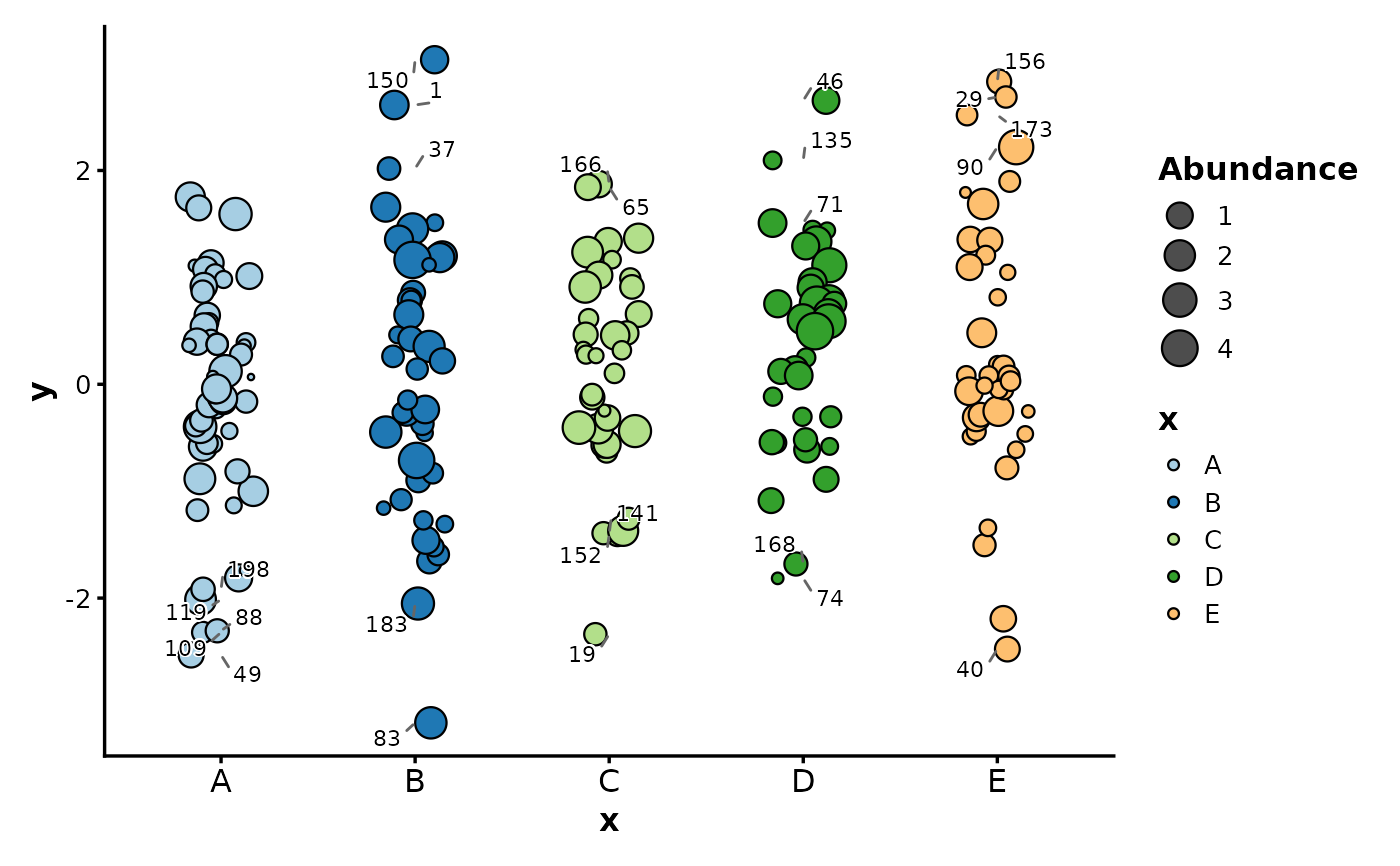 JitterPlot(df, x = "x", y = "y", size_by = "size", label_by = "id", nlabel = 3)