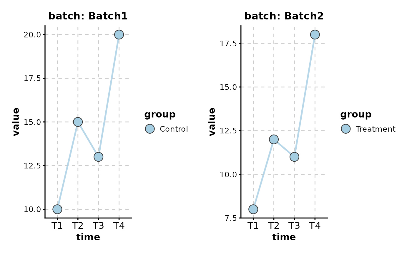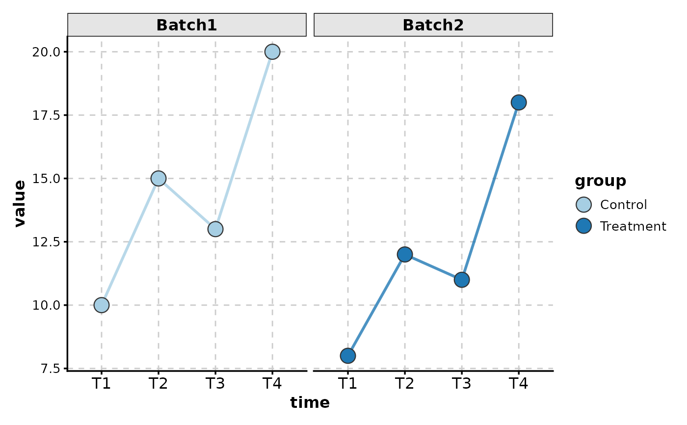 LinePlot(data, x = "time", y = "value", group_by = "group", facet_by = "batch")