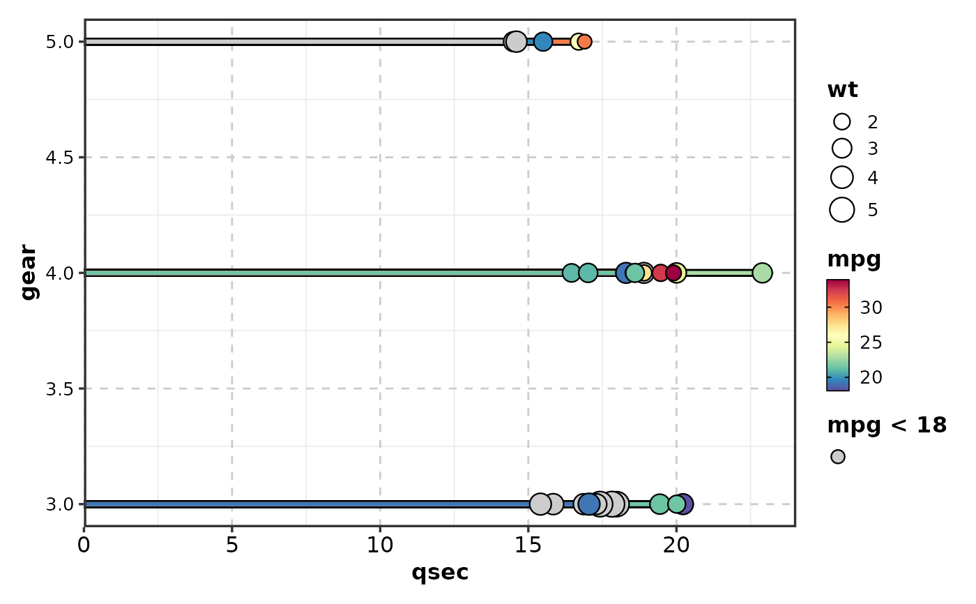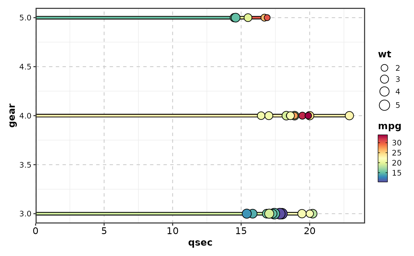 x = "qsec", y = "gear", size_by = "wt",
