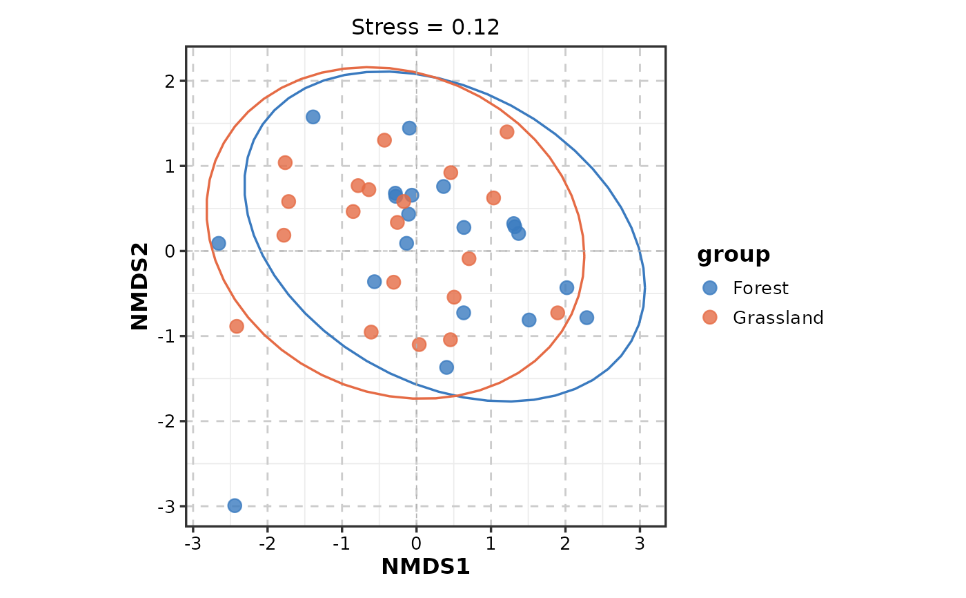 Creates ordination biplot for ecological and microbiome data. Unlike DimPlot (designed for single-cell UMAP/tSNE), this supports biplot arrows for species scores and environmental vectors, confidence ellipses, and stress values. Works with vegan ordination objects or pre-computed score data frames.