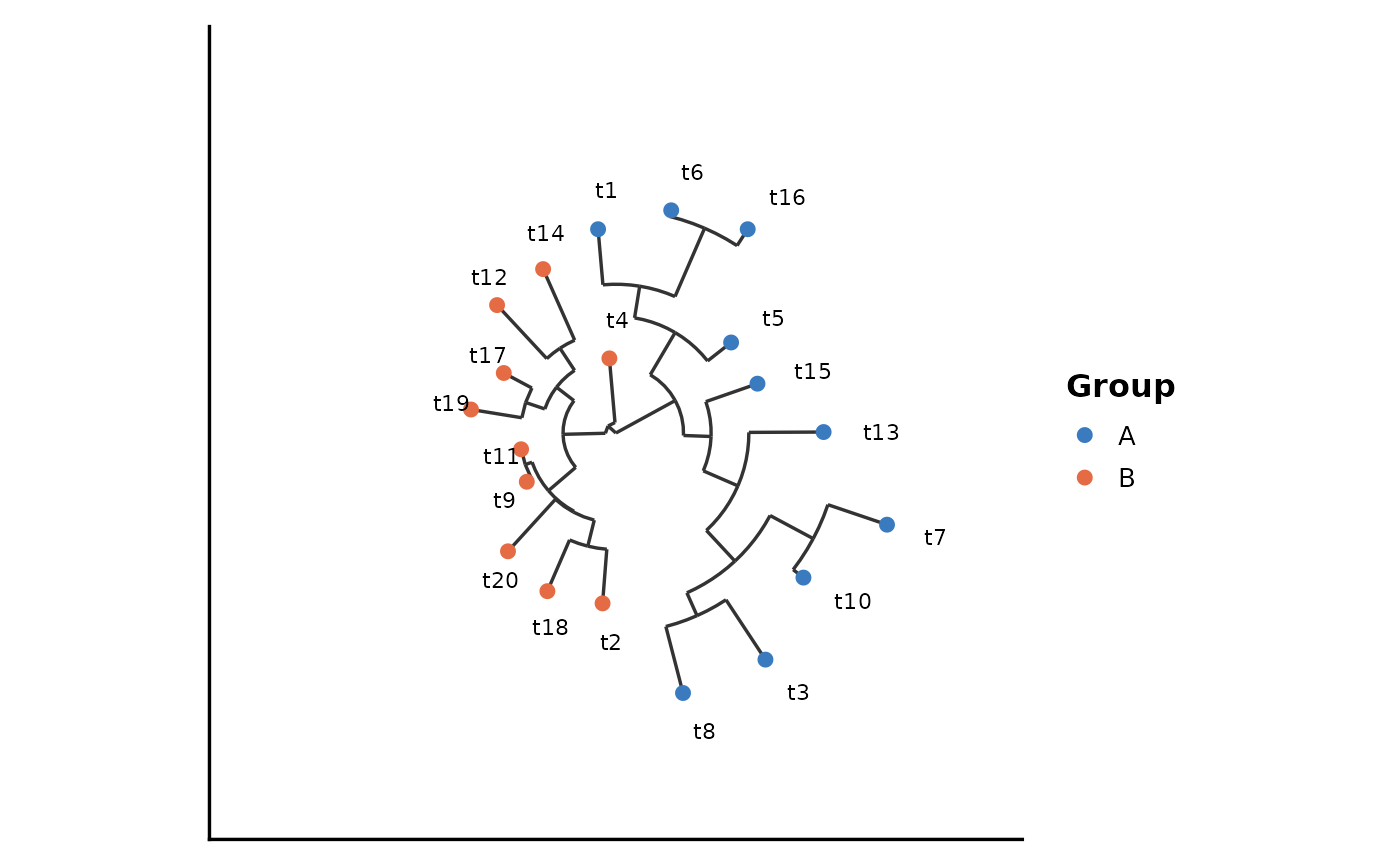PhyloTreePlot(tree, group_by = groups, layout = "circular")