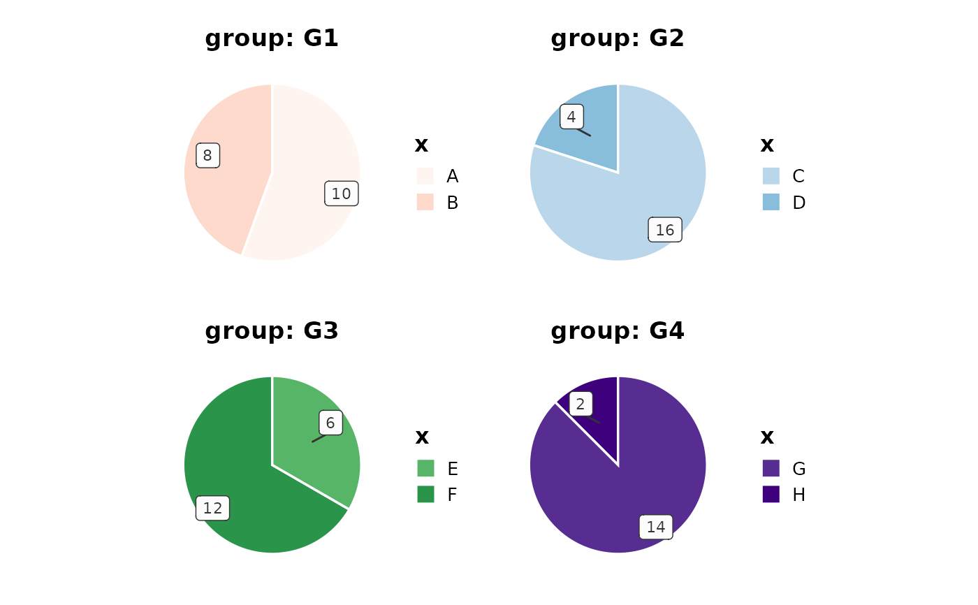 Creates pie charts to illustrate numerical proportion of each group. Supports splitting by groups, faceting, and custom color palettes.