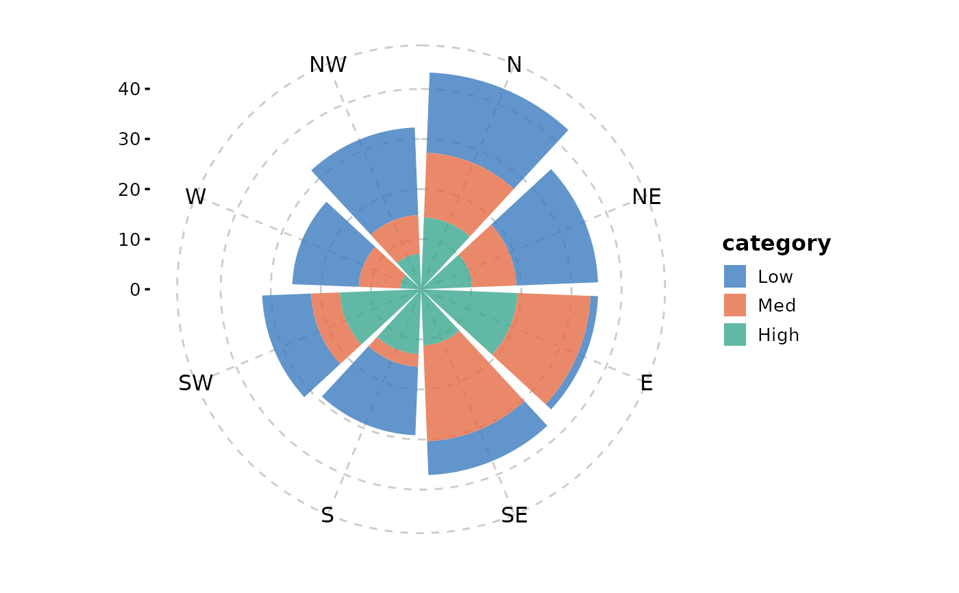 Creates polar coordinate plots for angular/directional data. Used in meteorology (wind roses), ecology (activity rhythms), chronobiology, and directional statistics.