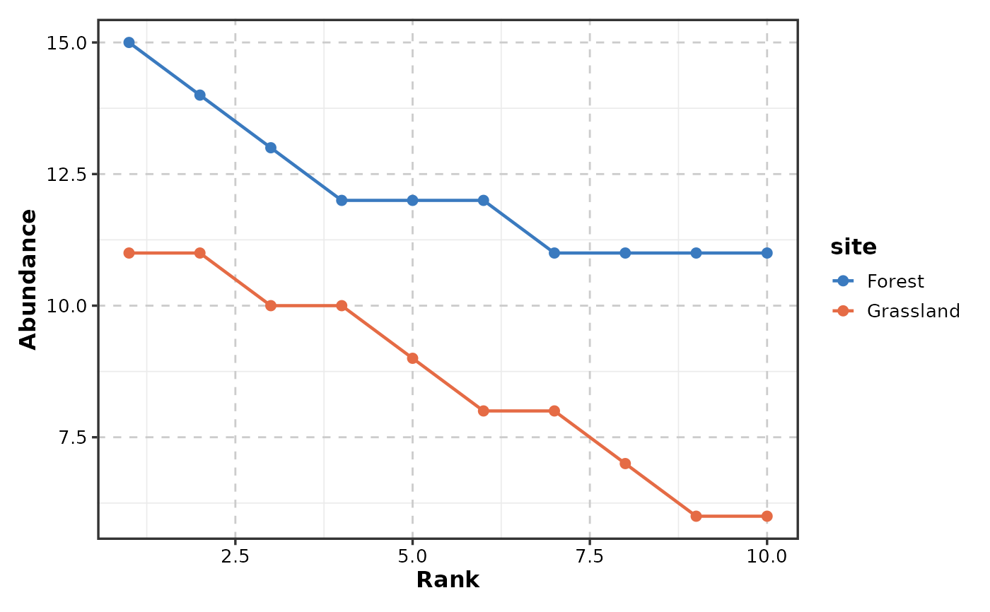 Creates rank-abundance curves (Whittaker plots) showing species abundance ranked from most to least abundant. Common in ecology for comparing community structure across sites or treatments.