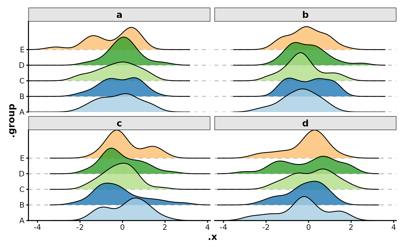 RidgePlot(data_wide, group_by = LETTERS[1:5], in_form = "wide", facet_by = "group")