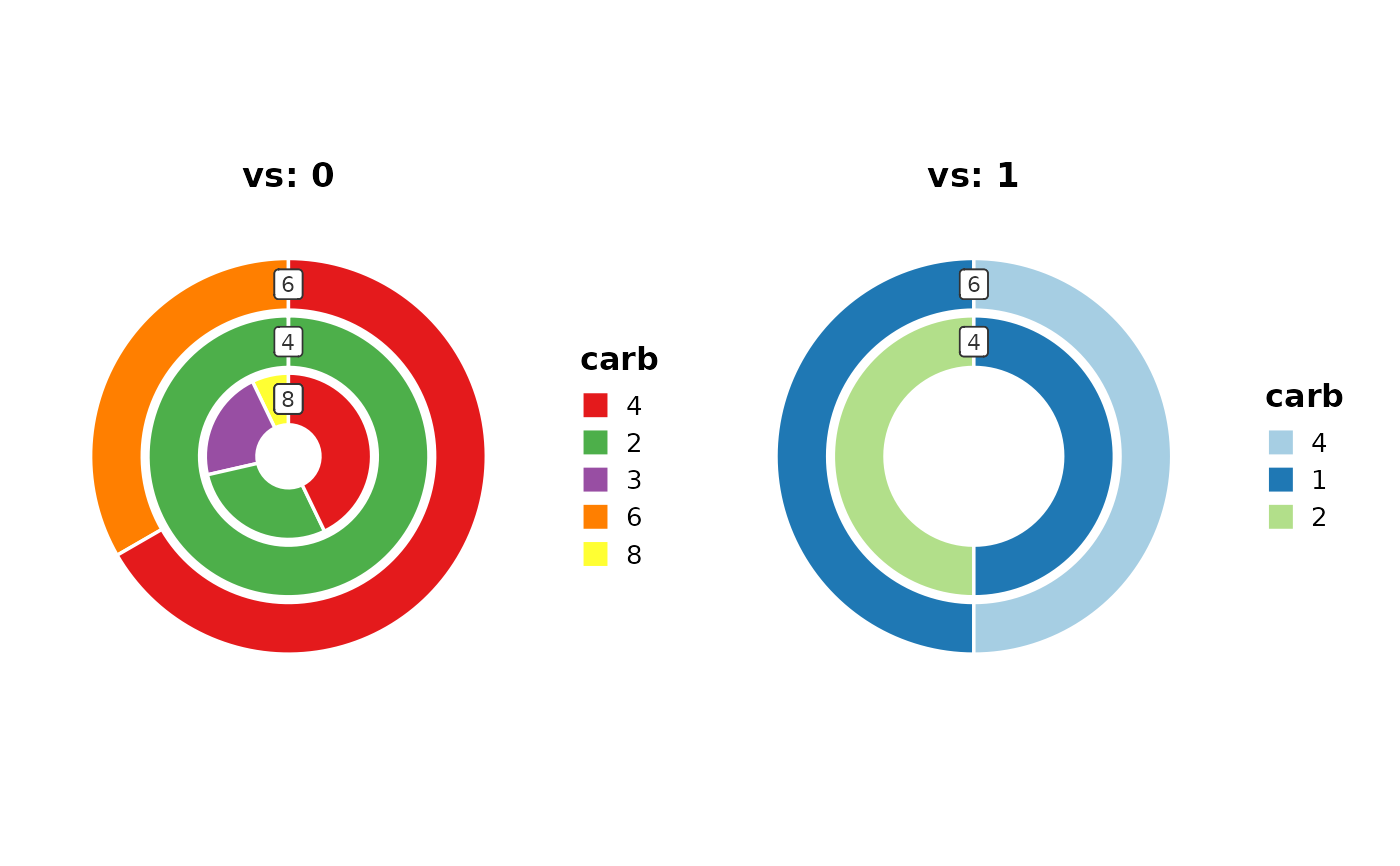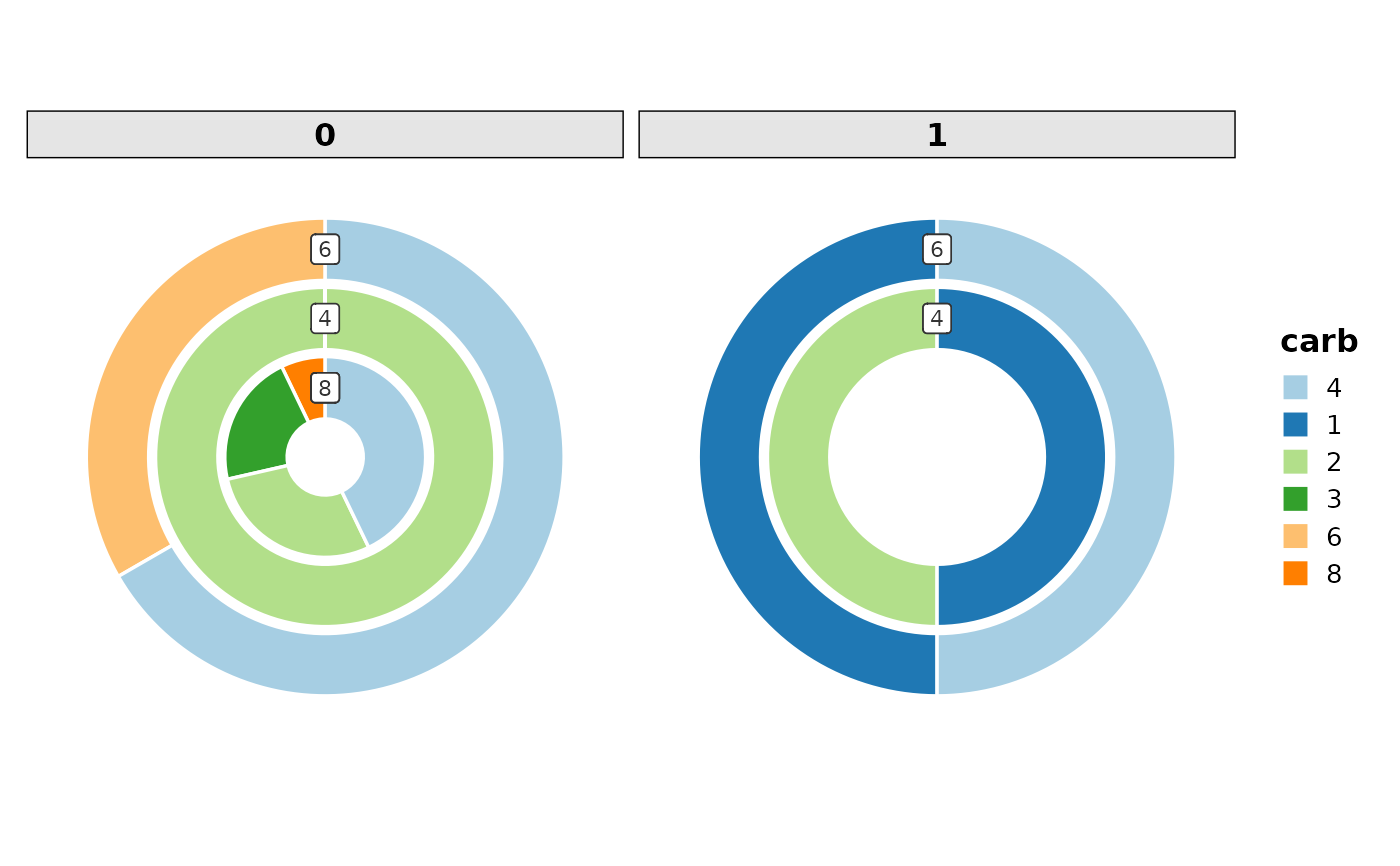 RingPlot(datasets::mtcars, x = "cyl", group_by = "carb", facet_by = "vs")