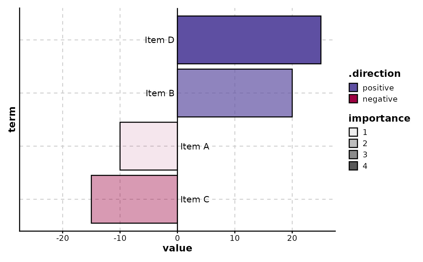 SplitBarPlot(data, x = "value", y = "term", alpha_by = "importance")