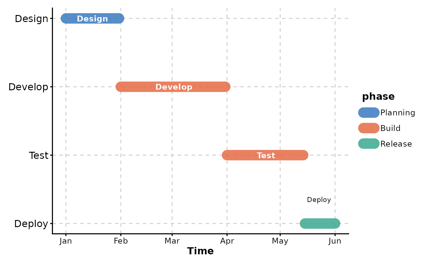 Creates timeline (Gantt-style) charts for visualizing events over time. Used in project management, clinical history, and historical timelines.