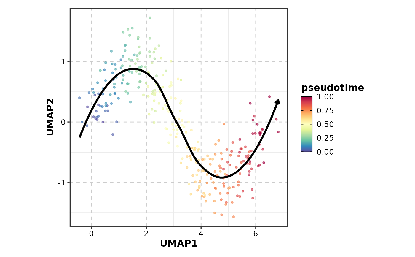 TrajectoryPlot(data, dims = 1:2, pseudotime = "pseudotime")