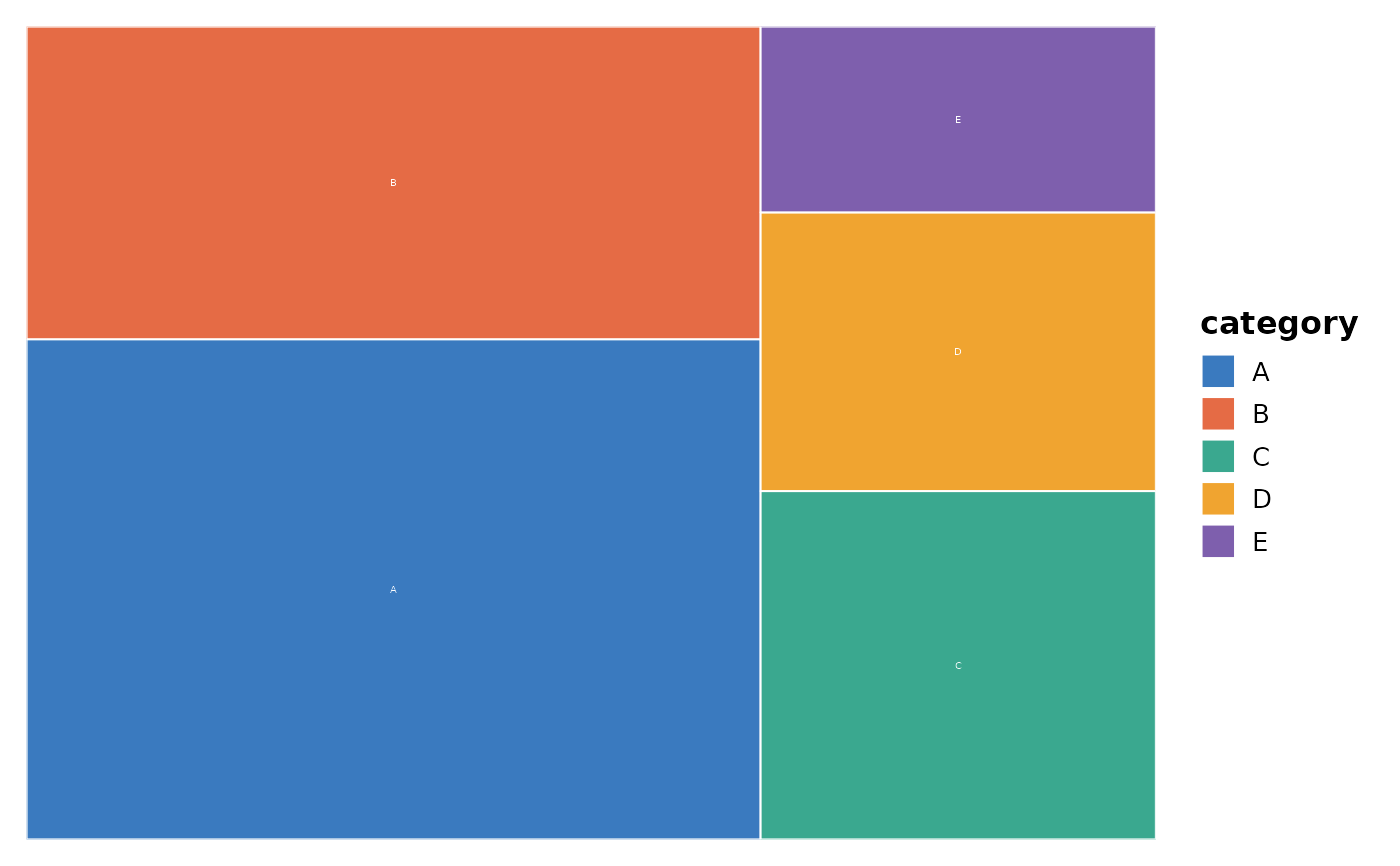 TreemapPlot(data, area = "value", fill = "category", group = "category")