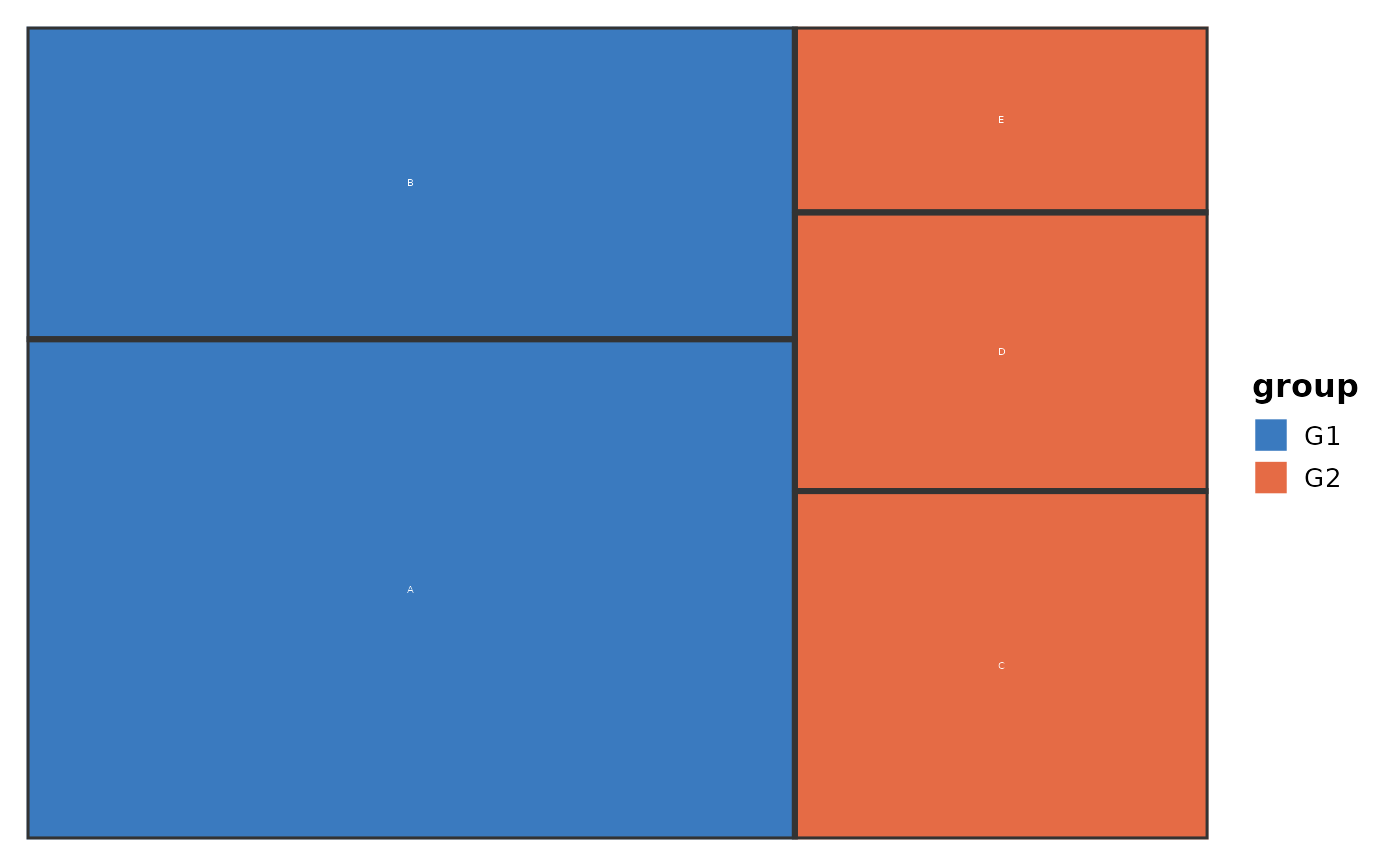 TreemapPlot(data, area = "value", fill = "group", group = "group",