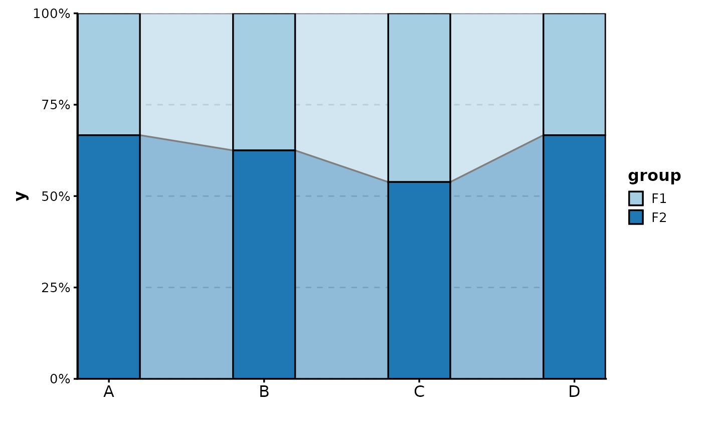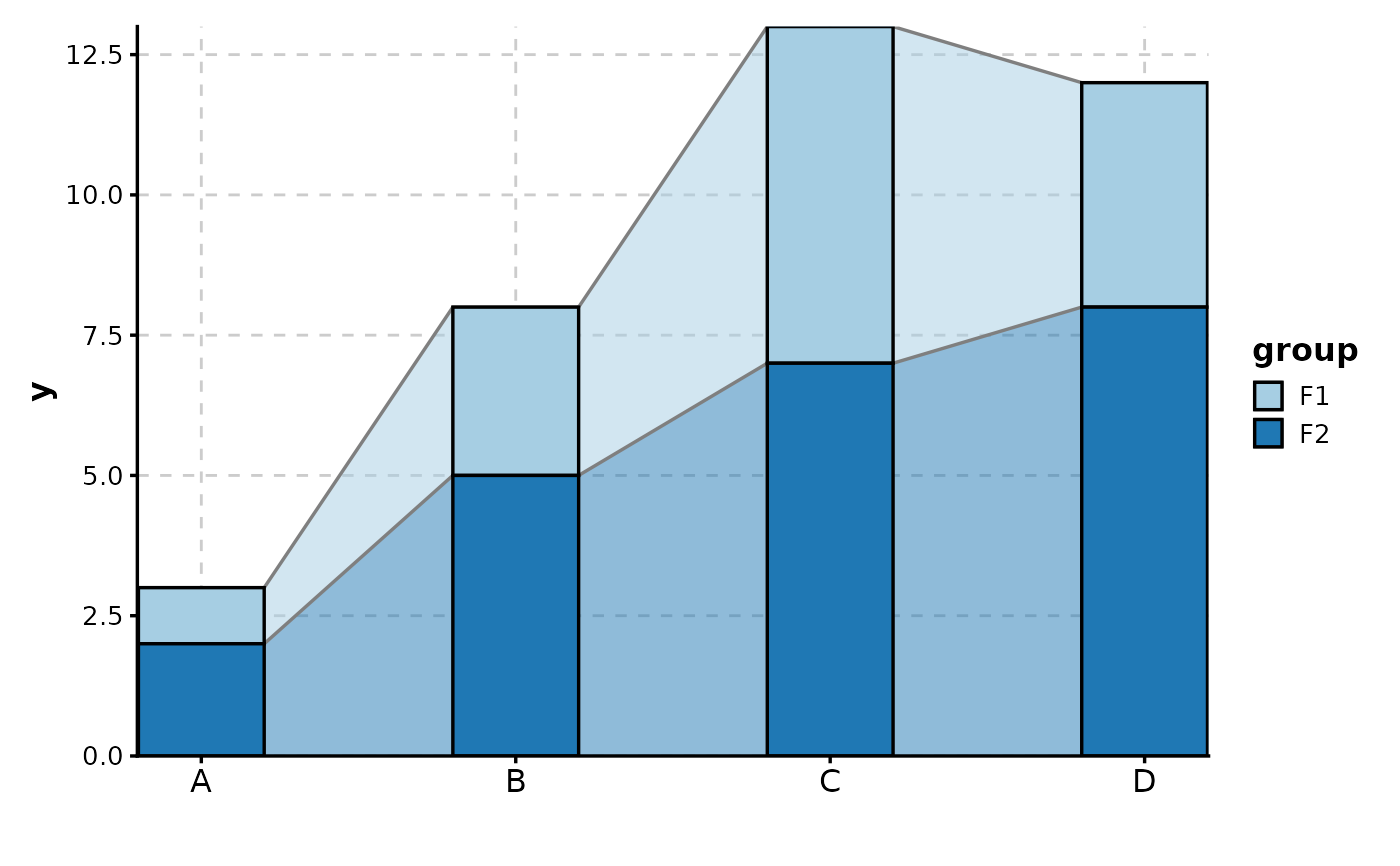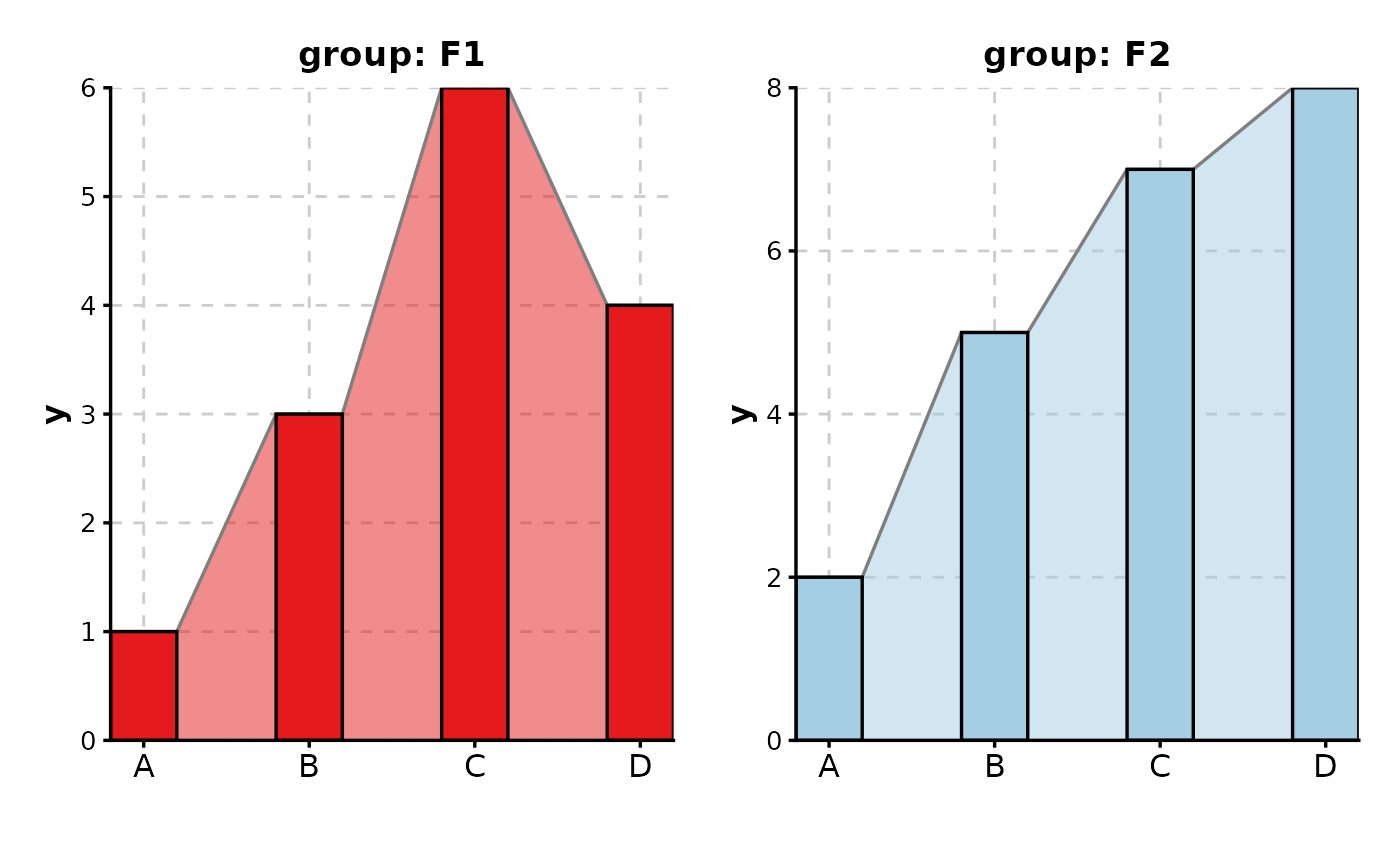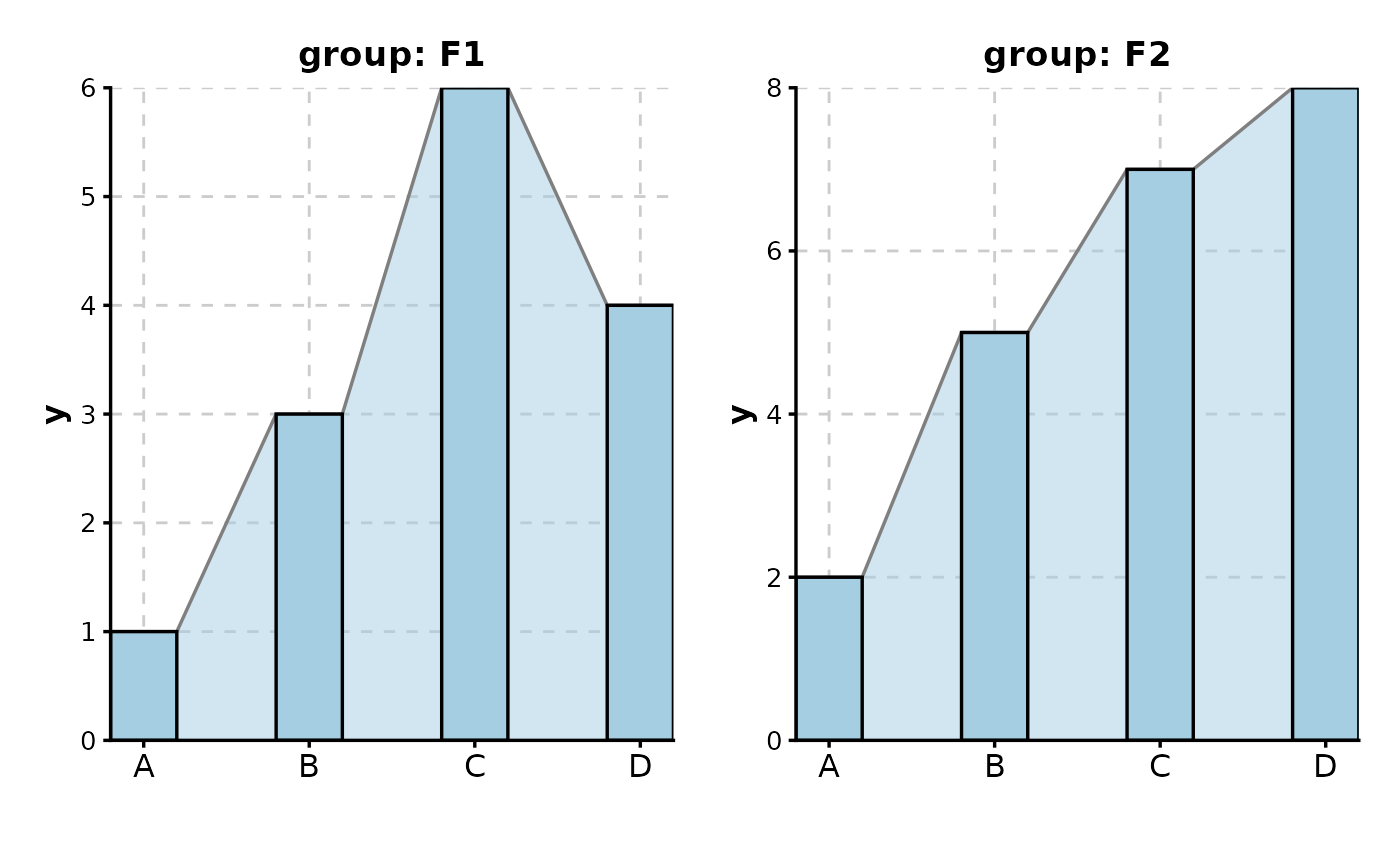 Creates trend plots that combine area and bar visualizations to show trends. Like an area plot but with gaps between the bars. Supports splitting by groups, faceting, and custom color palettes.