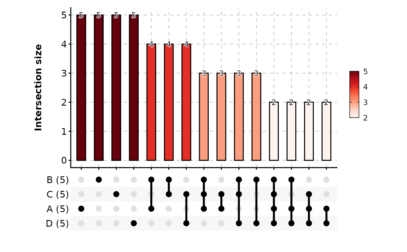 UpsetPlot(data, palette = "Reds", specific = FALSE)