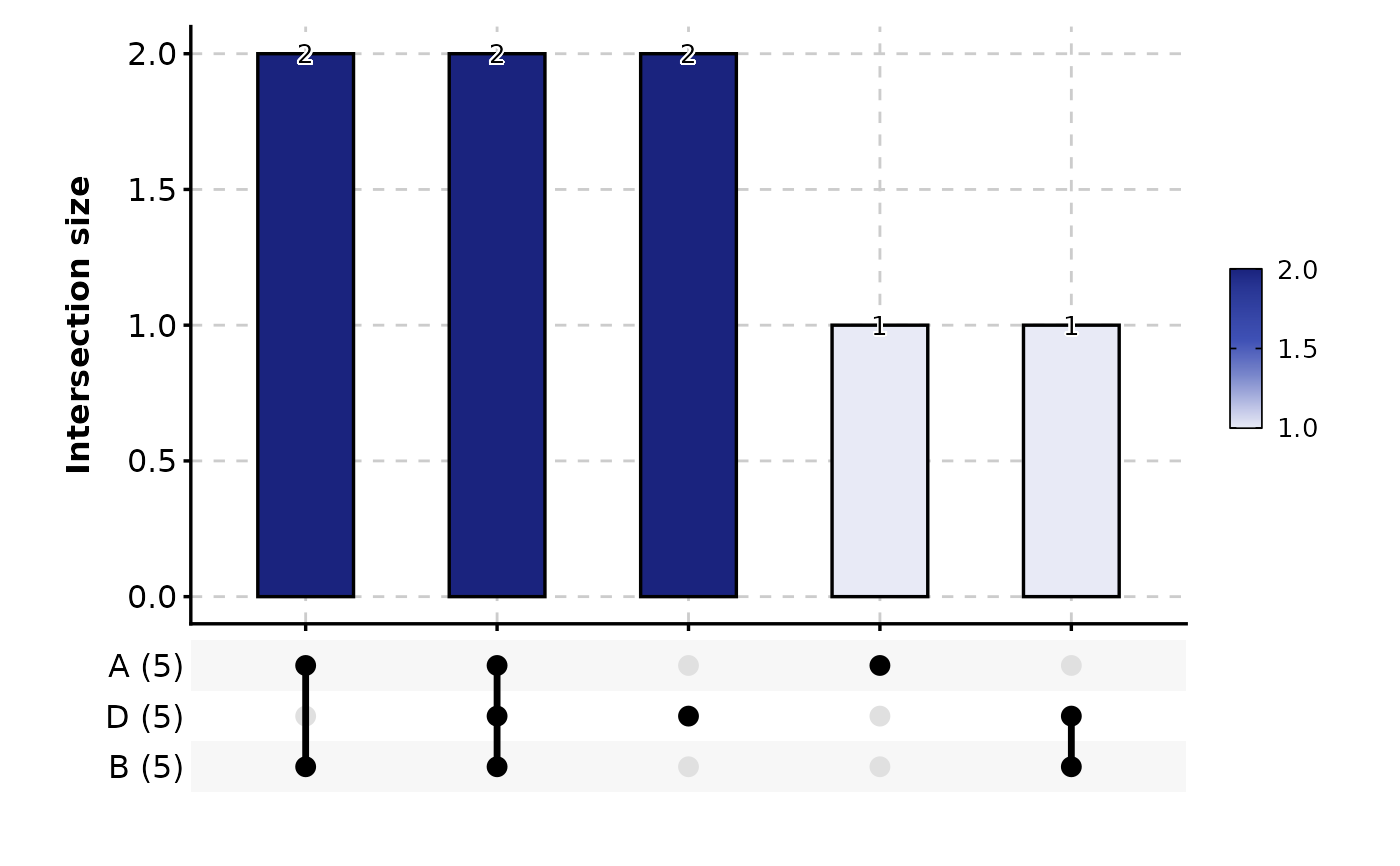 UpsetPlot(data, n_sets = 3, n_intersections = 10)