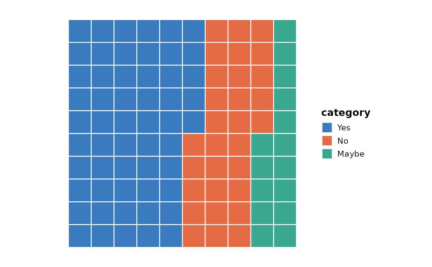 Creates waffle (square pie) charts for proportional data visualization. An alternative to pie charts that uses a grid of squares.