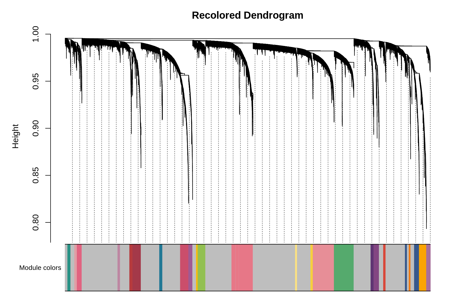 Here we demonstrate how to assign new colors to the hdWGCNA modules using the ResetModuleColors function. This function takes a list of new colors to replace the old colors, or a named list in order to change the colors selected modules. The ordering of the colors depends on the factor level of the hdWGCNA modules themselves. Additionally, this function ensures that the “grey moddule”, which contains genes that did not get assigned to a co-expression module, remains grey.
