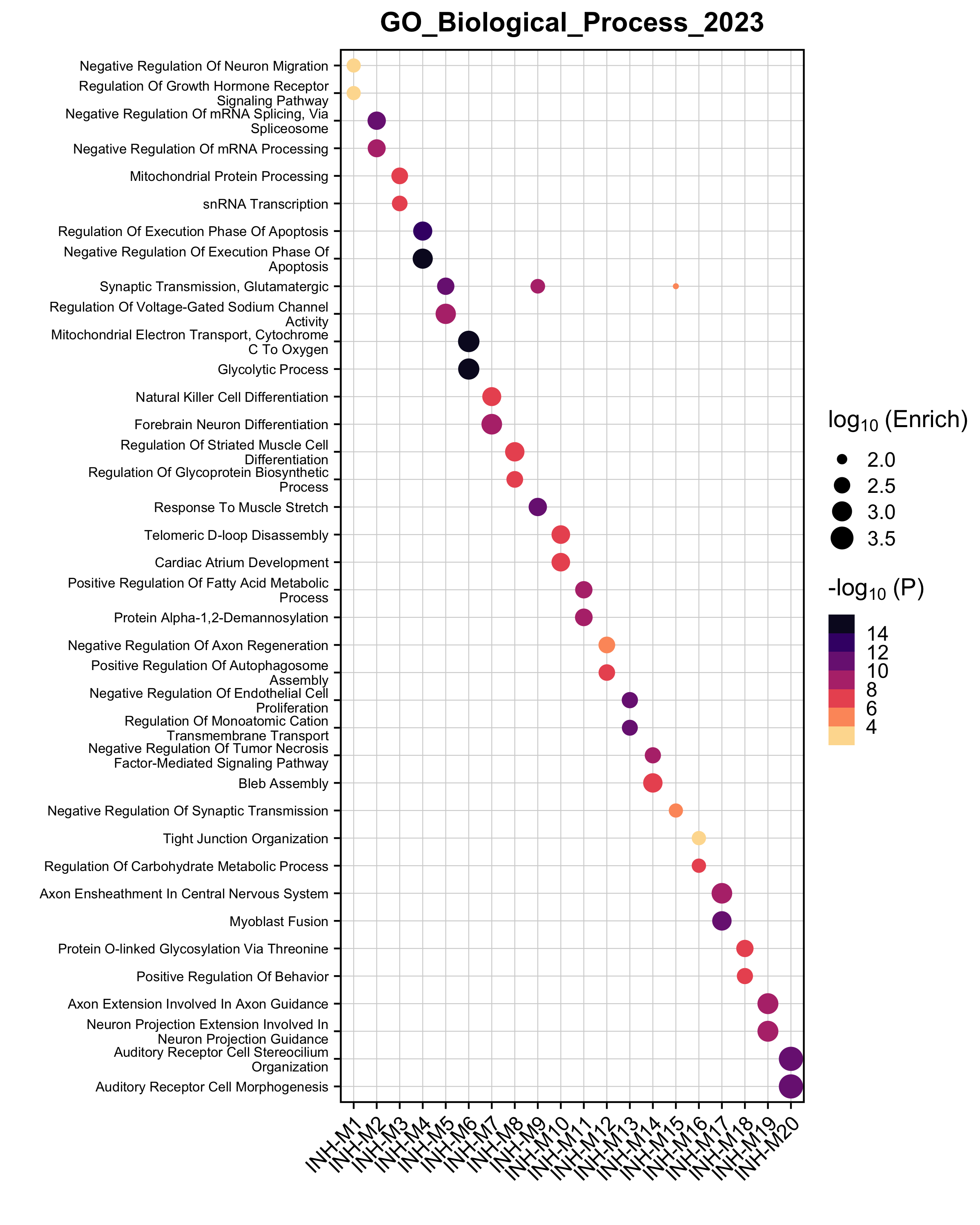 In this plot, the dot size shows the enrichment and the color shows the significance level. Terms are only shown in a module if the enrichment is significant (p < 0.05).
