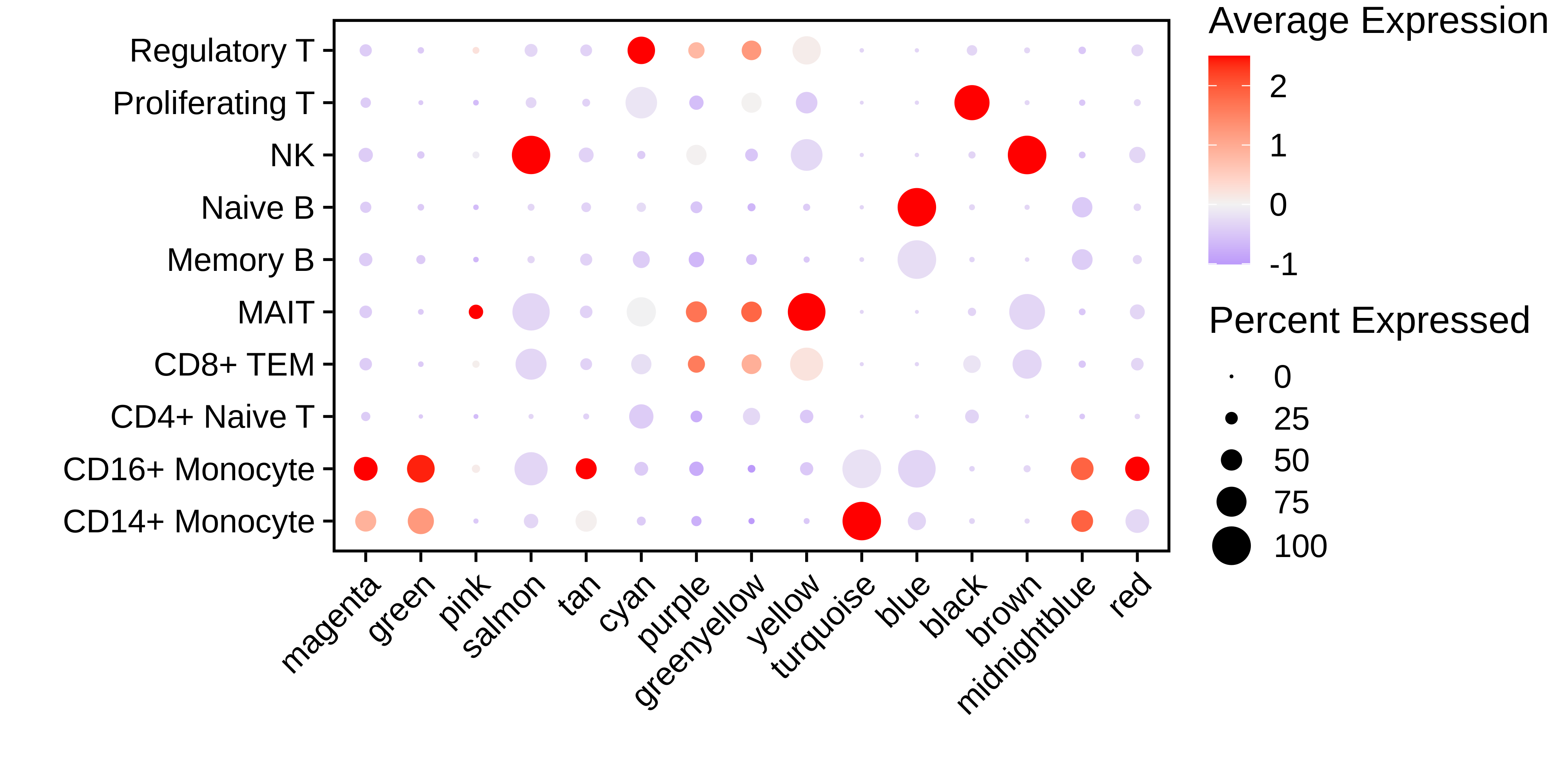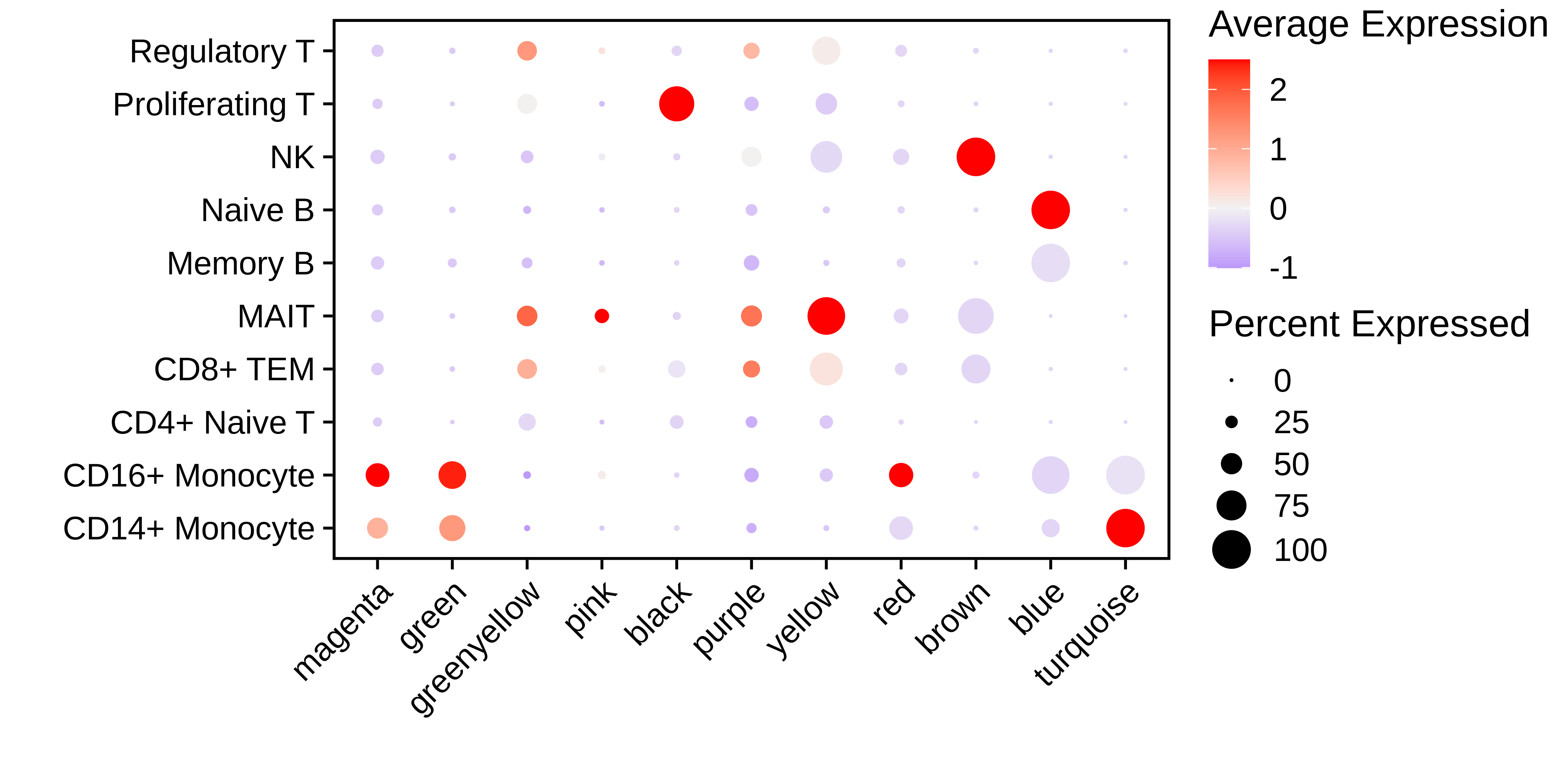 Next we visualize the MEiso signatures for each module in each cell population using a DotPlot.