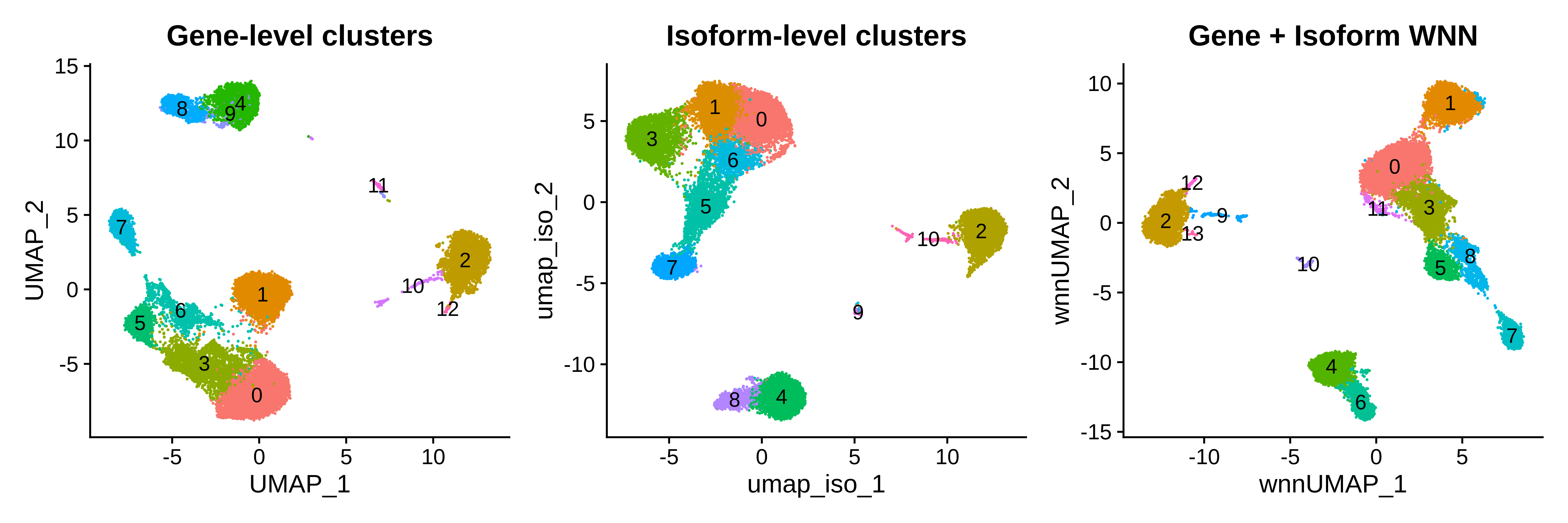 In this section, we will perform clustering analysis on MAS-Seq dataset using Seurat. In principal, this analysis could also be performed using alternative pipelines such as Scanpy before performing network analysis. We perform the standard clustering steps including quality control (QC) filtering, normalization, feature selection, linear dimensionality reduction (PCA), batch correction (harmony), non-linear dimensionality reduction (UMAP), and louvain clustering. Here we perform the clustering analysis using the gene counts matrix and the isoform counts matrix separately to compare the differences.
