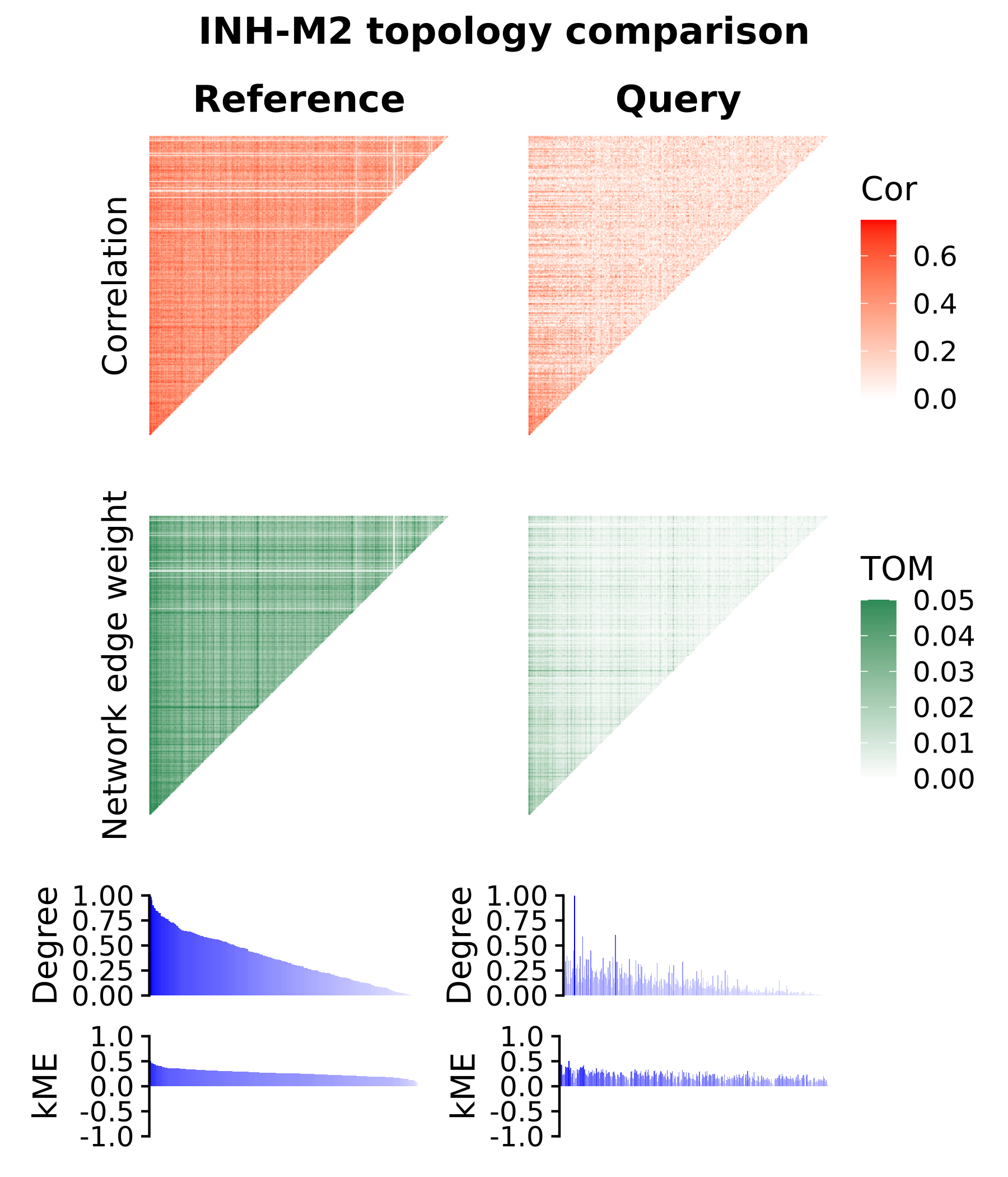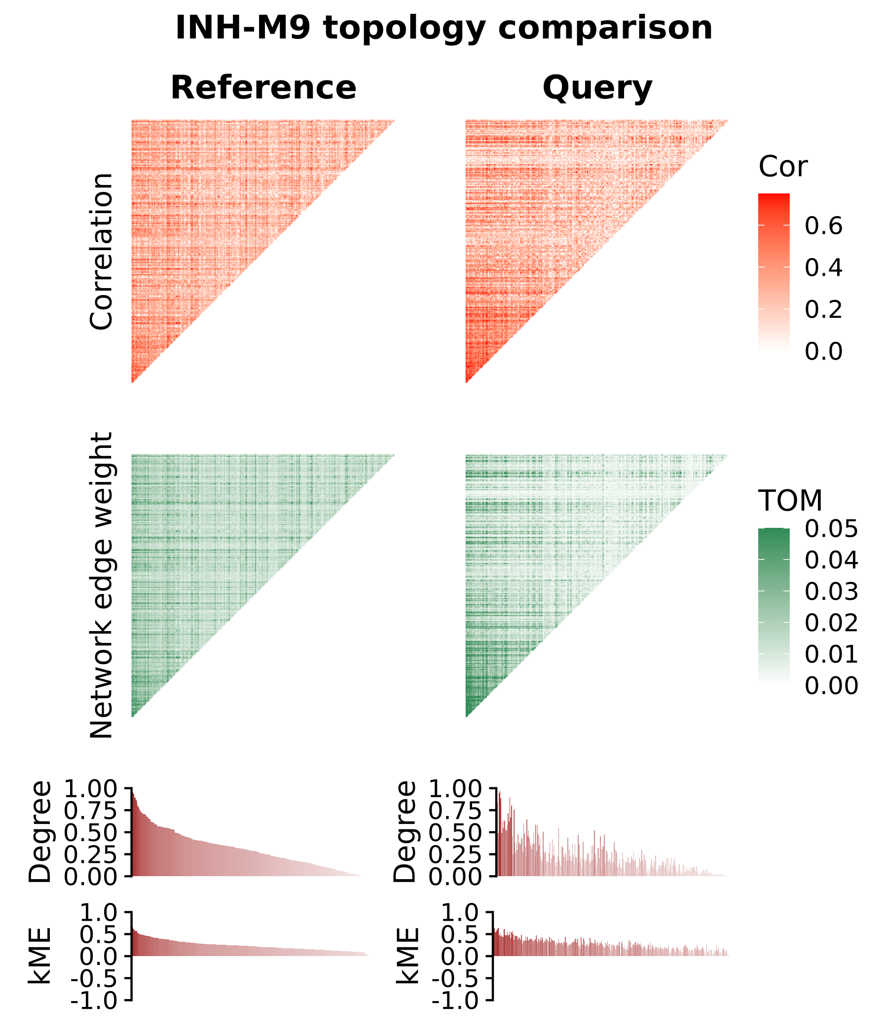 In the module topology plots for module INH-M9, we overall see similar signals in the correlation matrix, the TOM, and in the degrees and kME rankings for each gene. This is in contrast to INH-M2, which was not significantly preserved, where the signal is clearly diminished. These plots effectively show us the differences and similarities in the co-expression network topology that are picked up in the module preservation analysis.