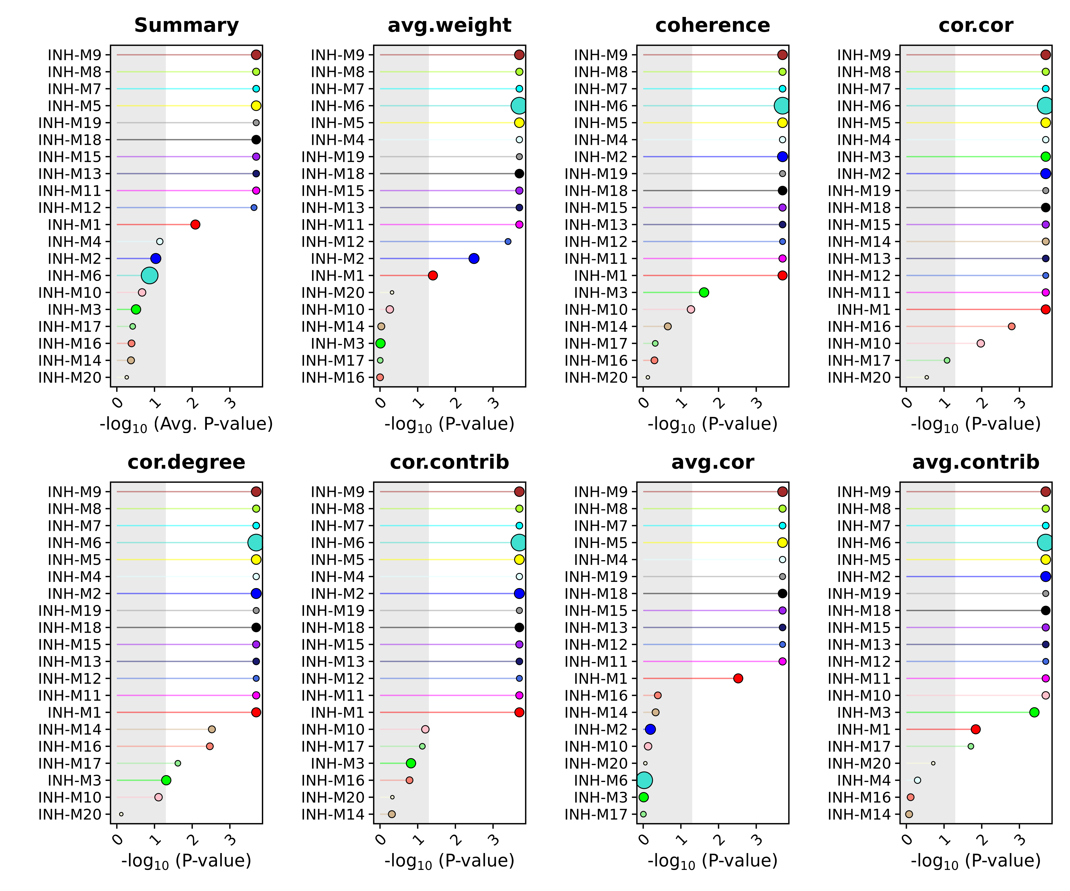 This plot shows us each module ranked by how well they module preserved in the query dataset. The x-axis is showing us the averaged FDR-corrected p-values from the different network attributes for each module to result in a composite statistic. The size of each dot corresponds to the number of genes in each module. We can also use this same function to plot the individual statistics. As a demonstration we also set fdr=FALSE to show how to look at the raw p-value rather than the FDR-corrected p-value based on the user’s preference.