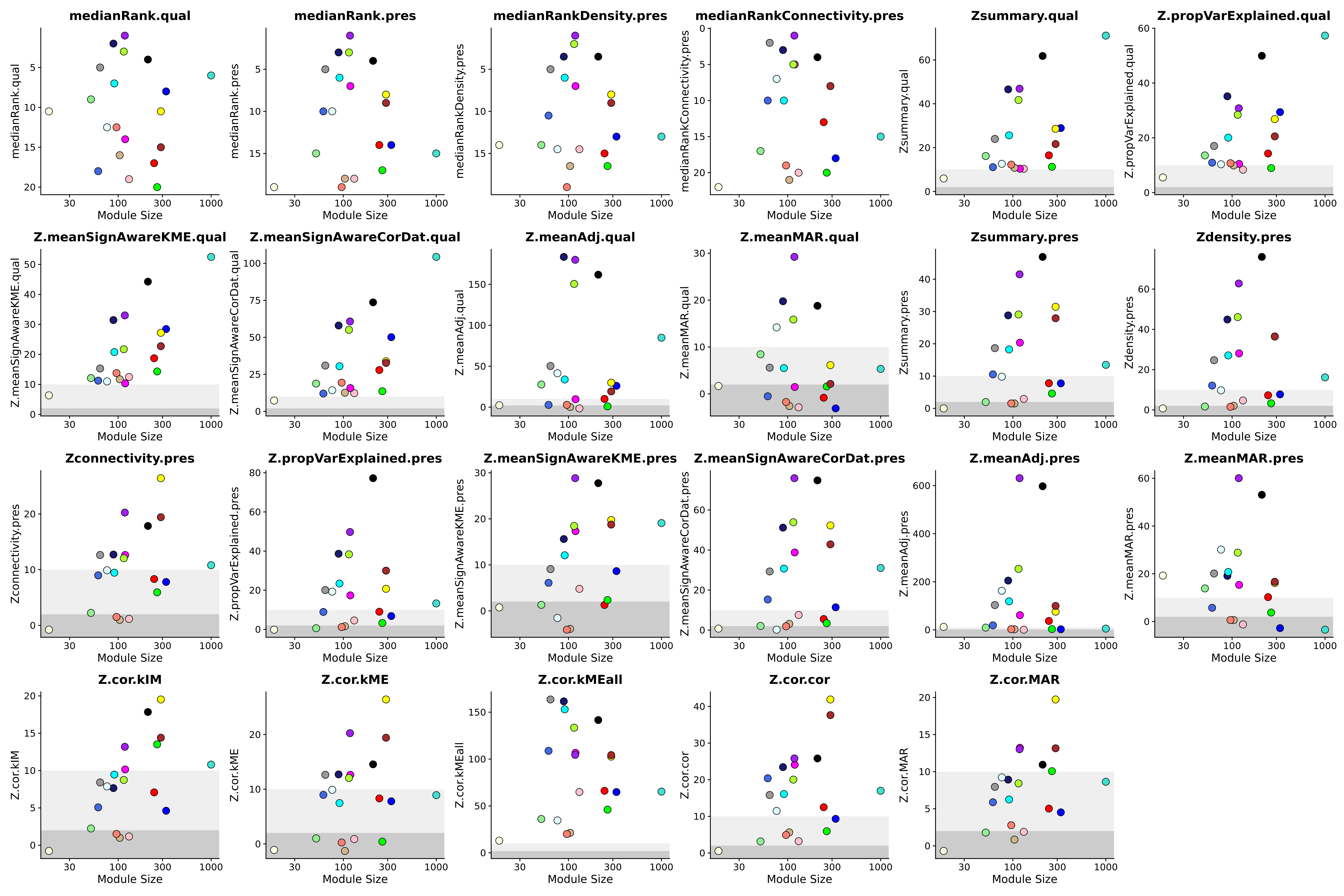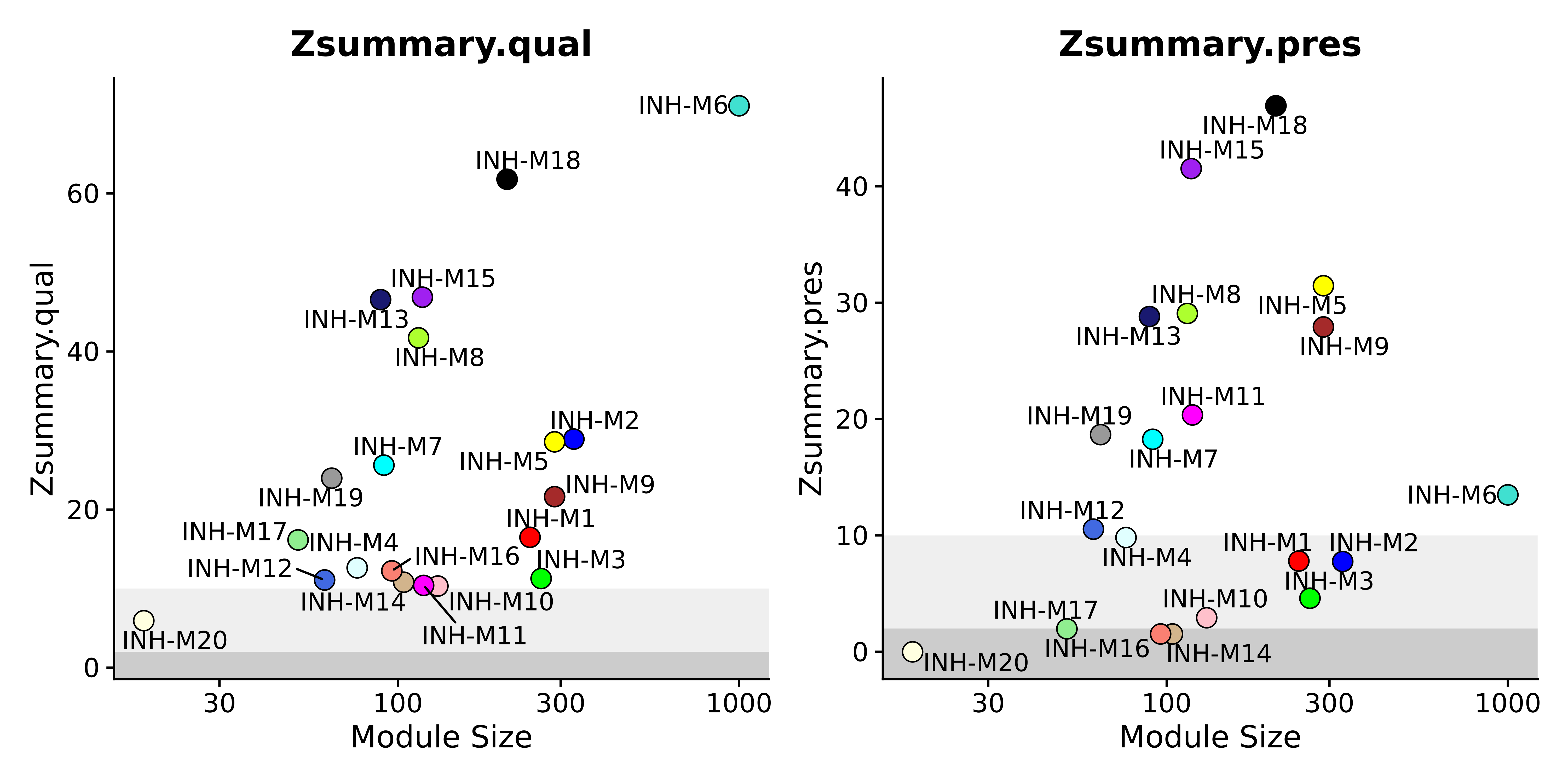 Here we can see three different shades in the background. These represent cutoff values for interpreting the Z summary statistics. The following guidelines help us understand the preservation of these modules.