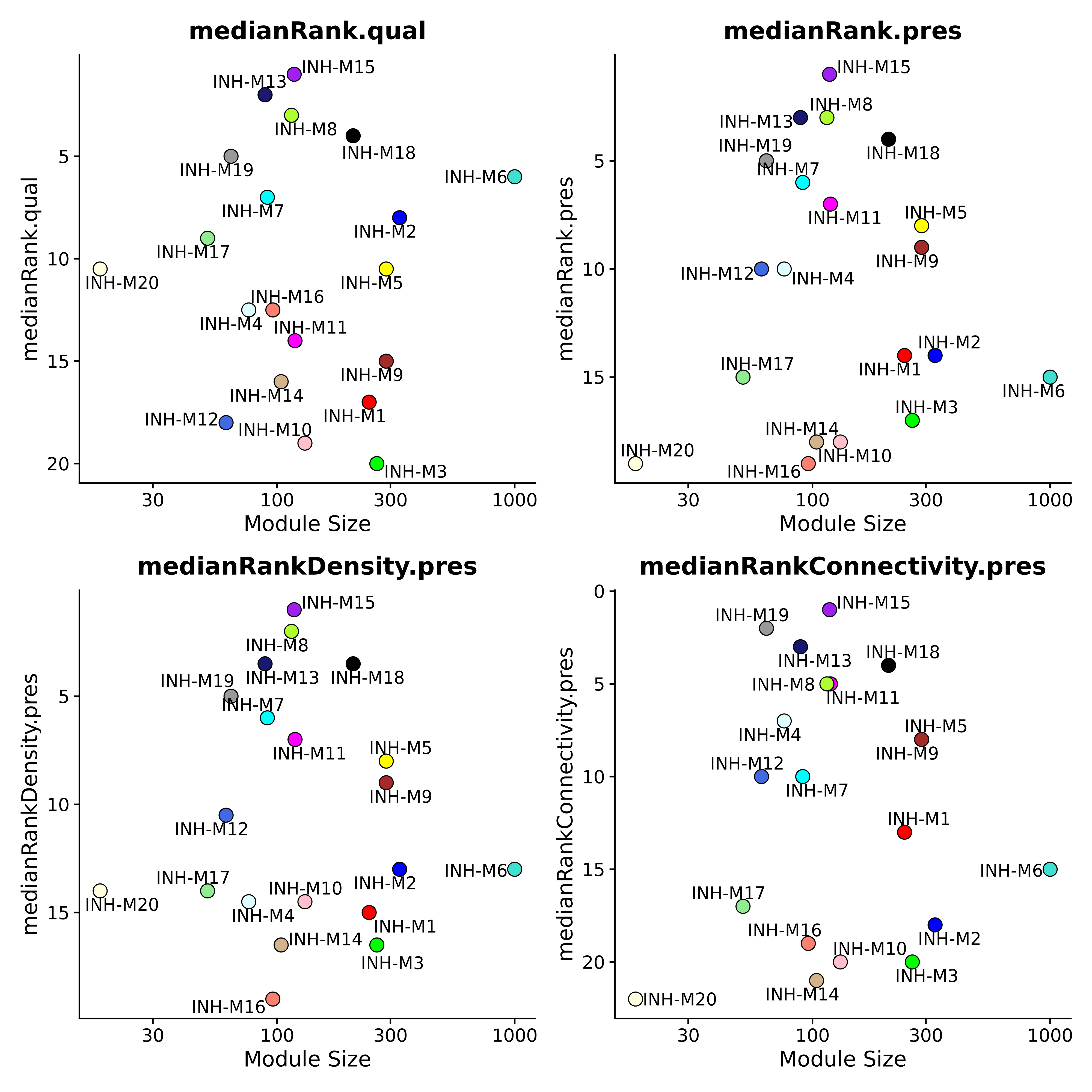 As another example, we can create a similar plot for a module which was not significantly preserved in the query dataset, INH-M2.