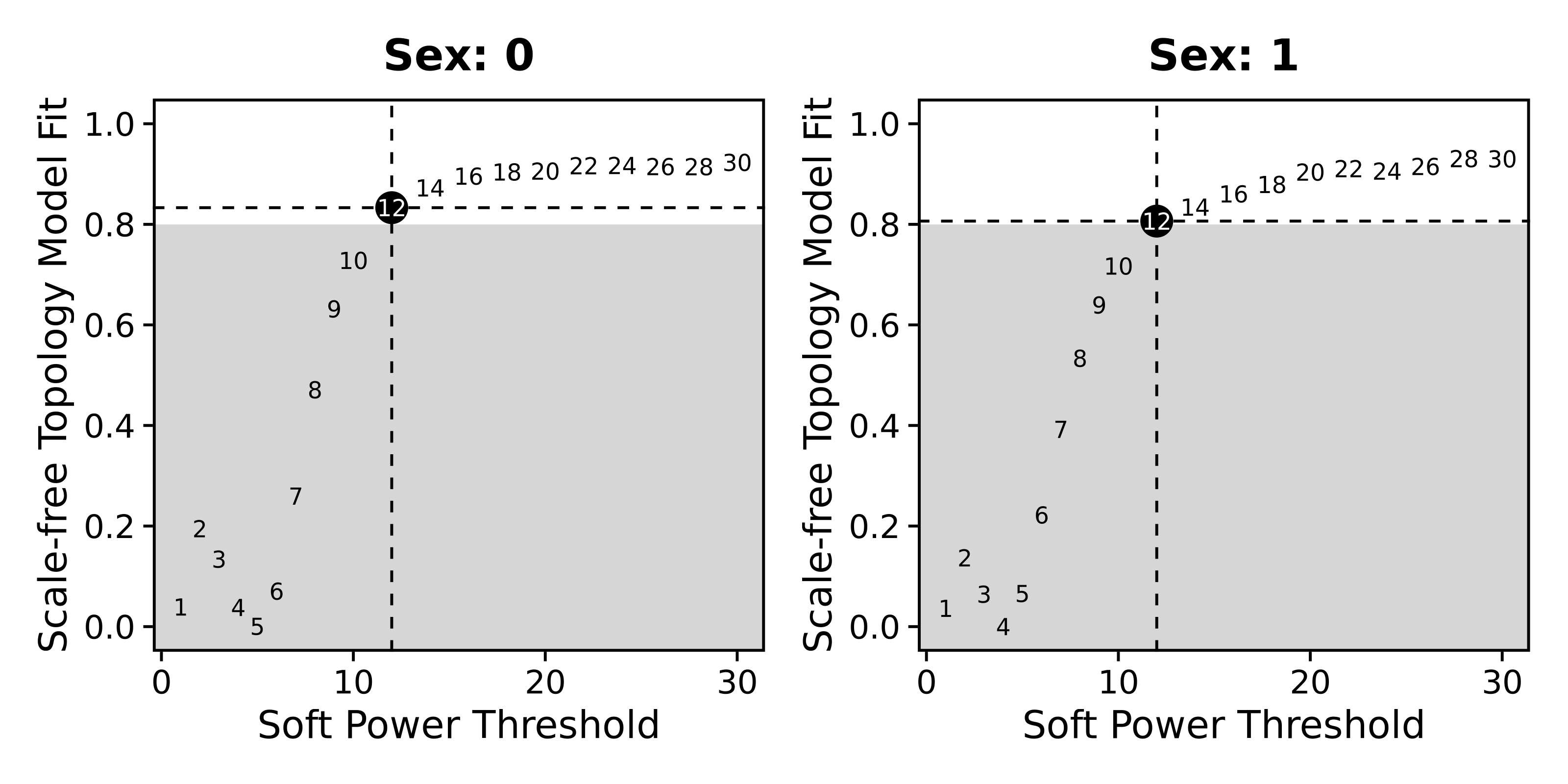 )For consensus network analysis, we need to perform the soft power threshold testing for each group, so next we use TestSoftPowersConsensus.