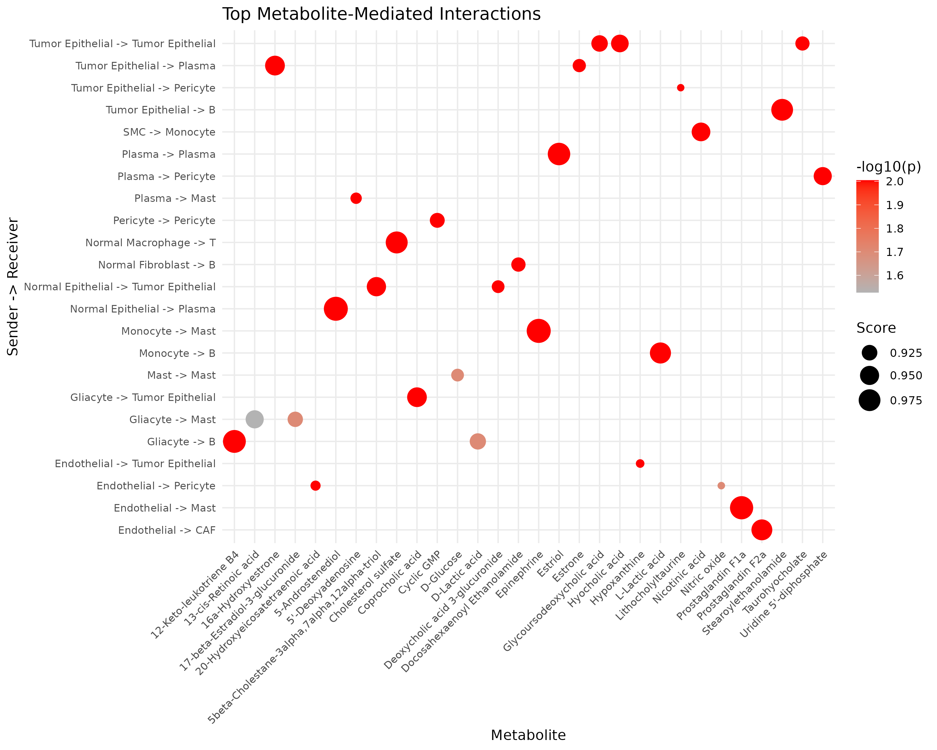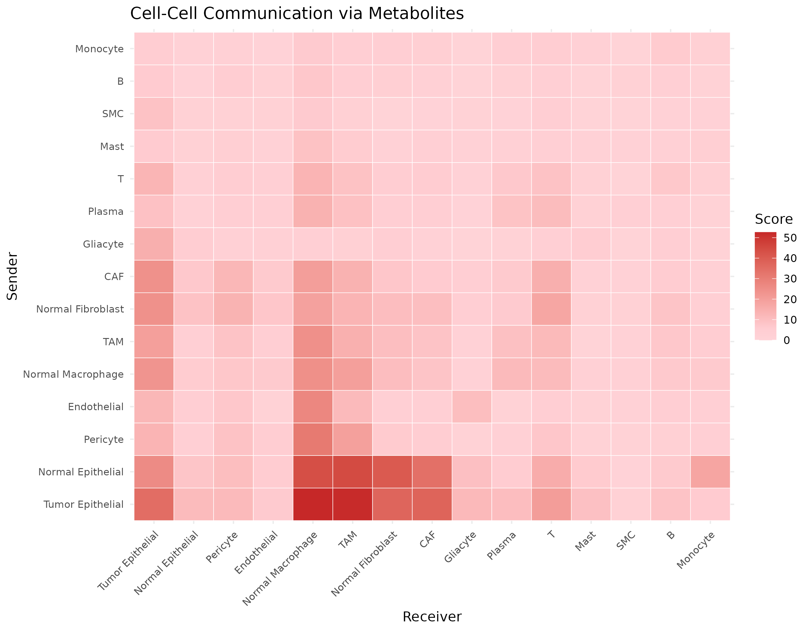 Figure 1: Basic Communication Heatmap. Pairwise communication scores aggregated across all significant metabolite interactions. Darker colors indicate stronger communication potential.