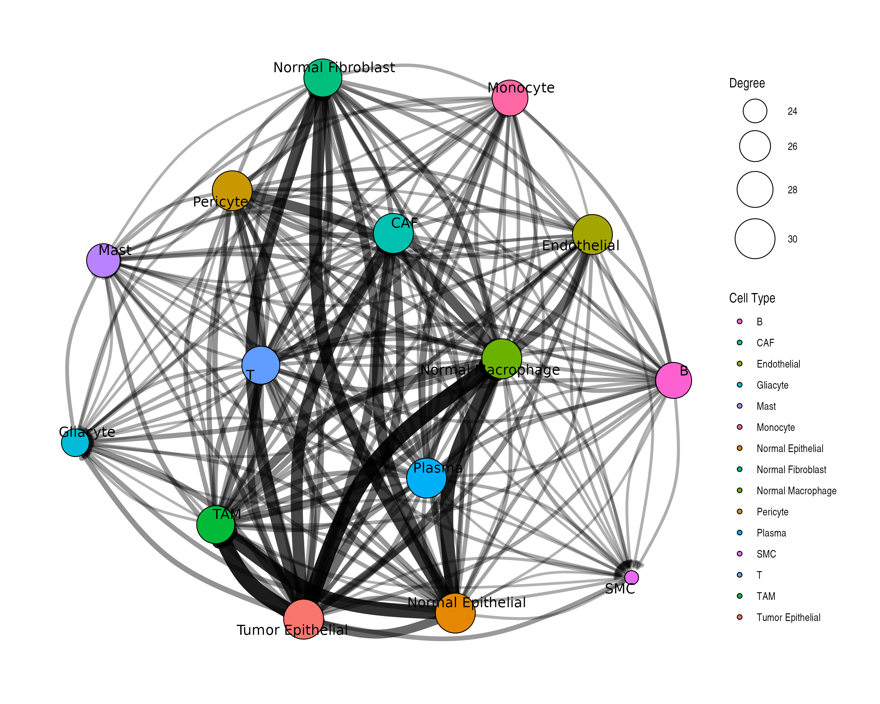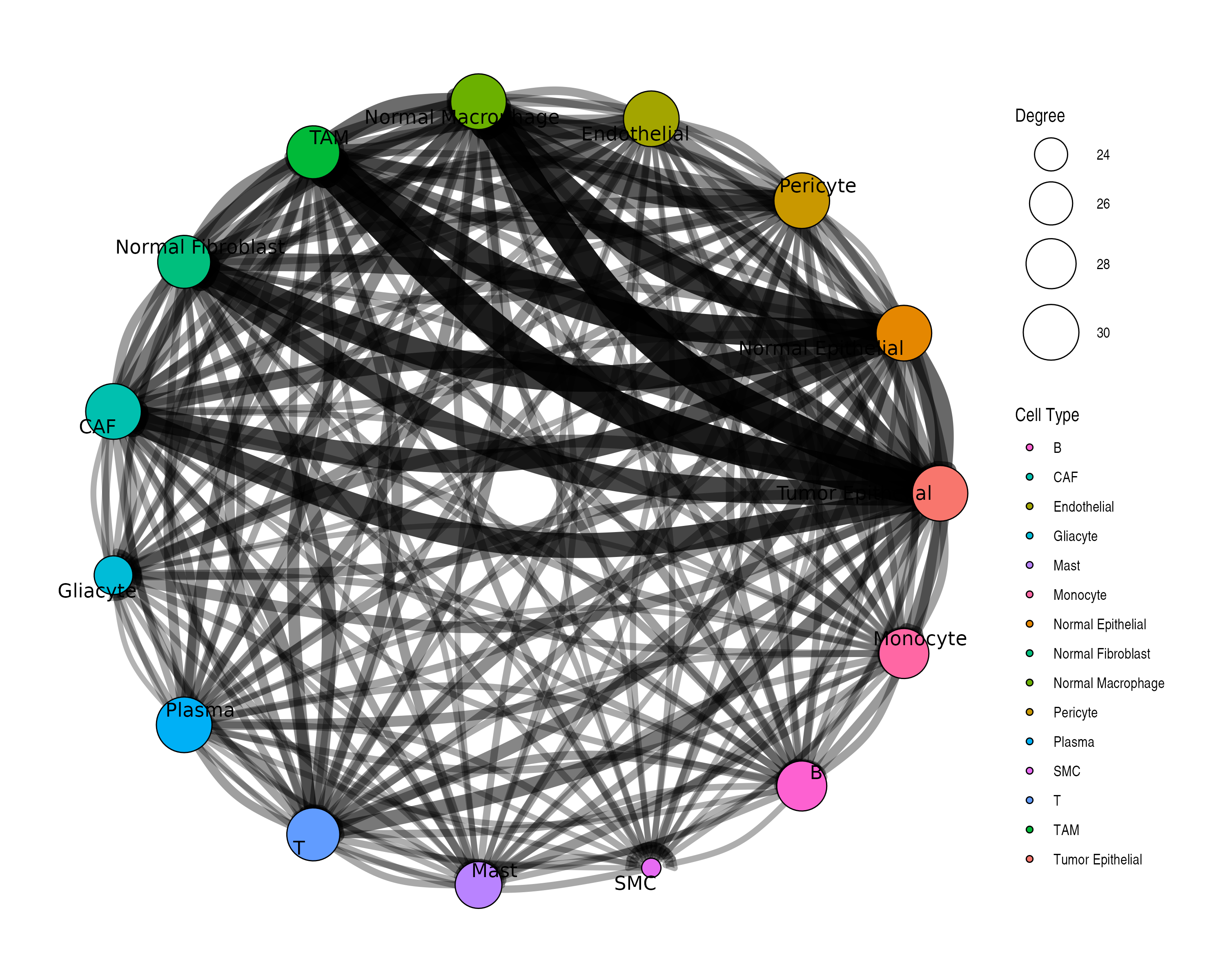 Figure 3: Communication Chord Diagram. Ribbons connect sender to receiver cell types. Ribbon width is proportional to communication strength, and colors represent the sender cell type.